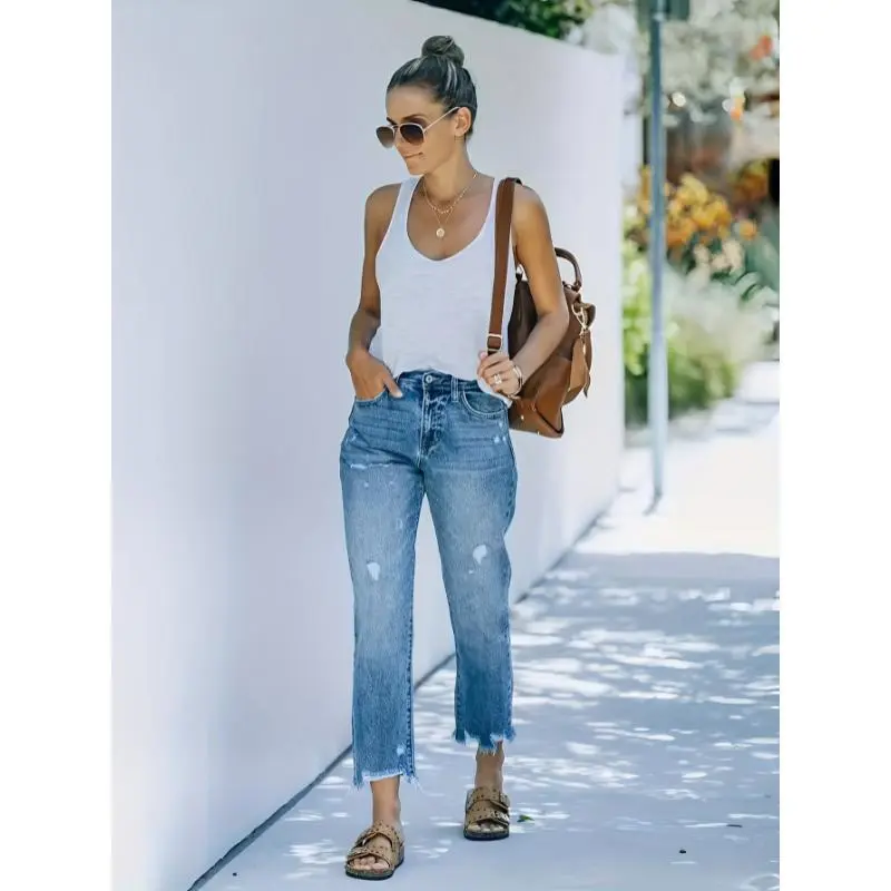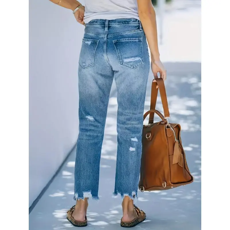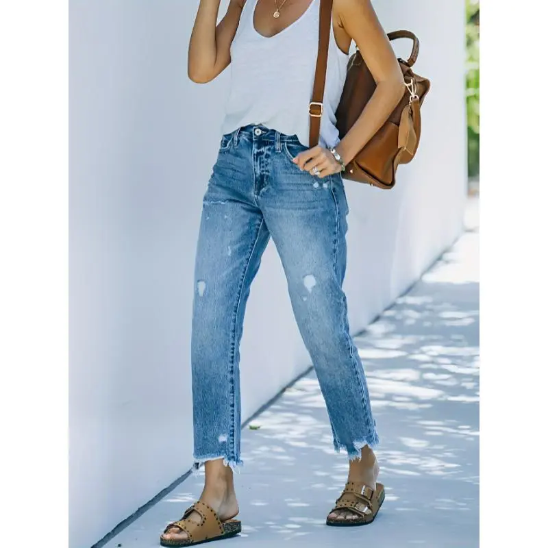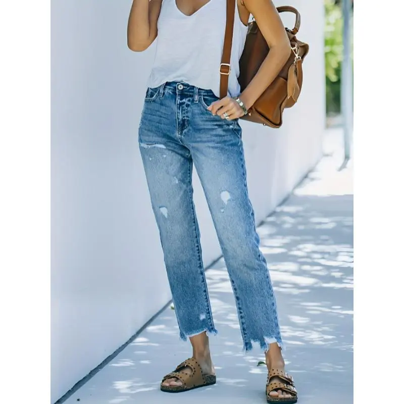 5. Tear off light blue casual nine minute straight wash jeans for women, raw linen tear off old jeans - washed blue diagonal pocket denim pants, suitable for streetwear style women's underwear, polyester pants, comfortable