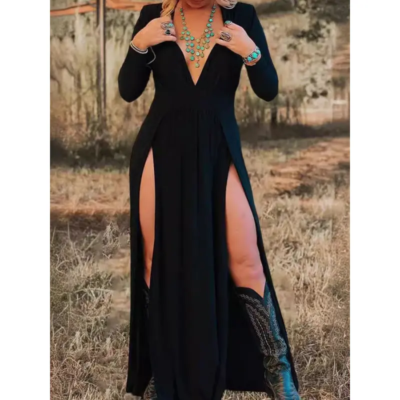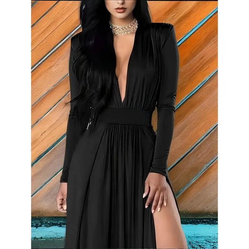 5. Elegant Women's Maxi Dress - Comfortable Polyester V-Neck with Side Split, Casual Fit, Flare Knit Fabric, Solid Color, Summer Black Womenswear Spandex Long Sleeve