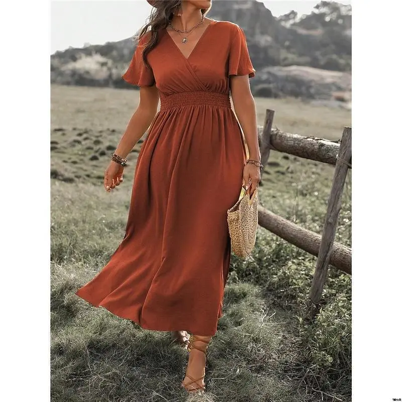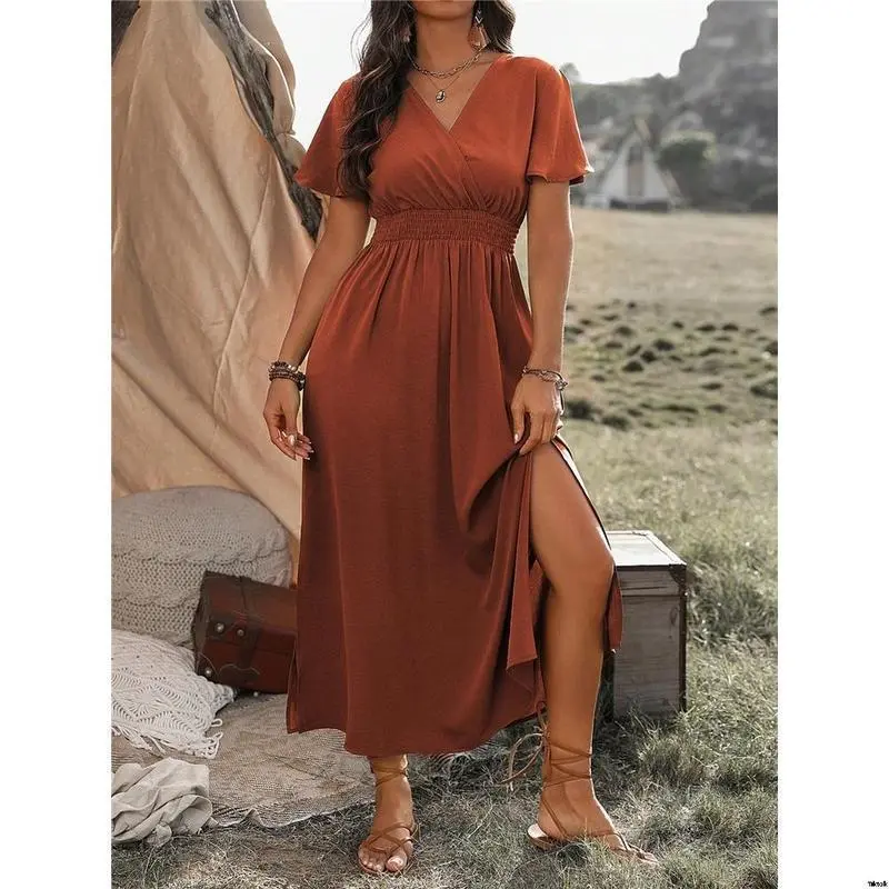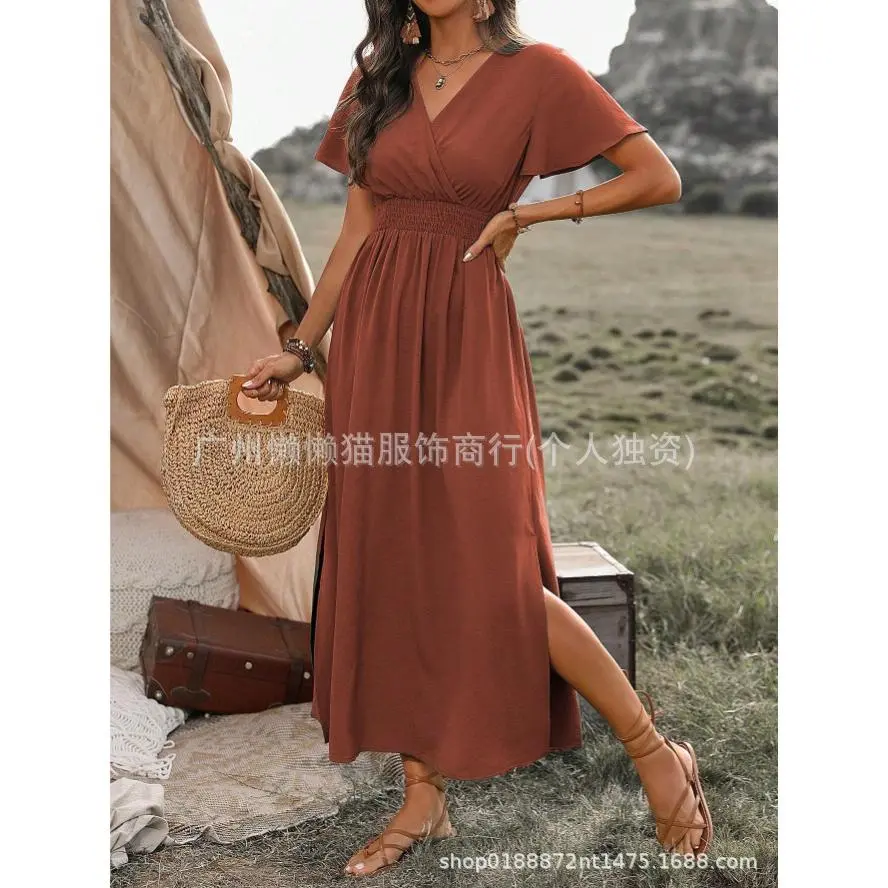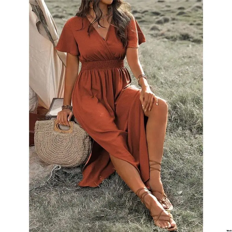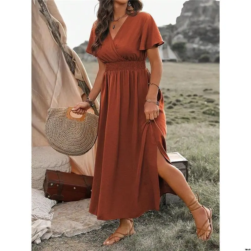 5. Hem Slit Waist V Size Plus tiktok Franclia - Neck Flounce Sleeve Tie Pleated Dress Maxi Women Outfit Blue Casual