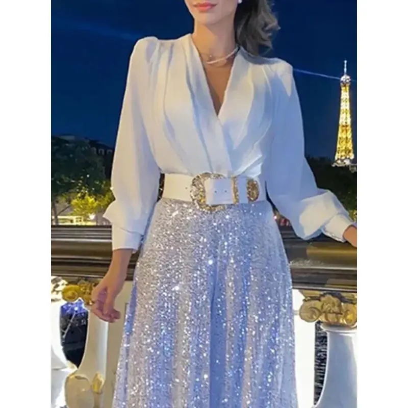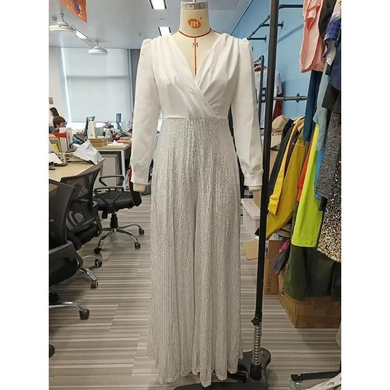 Splice Sequins Maxi Dresses For Women Fashion Folds Loose V Neck Elegant Dress Femme Party Evening Dresses Luxury 2024 Formal Womenswear Green Basic