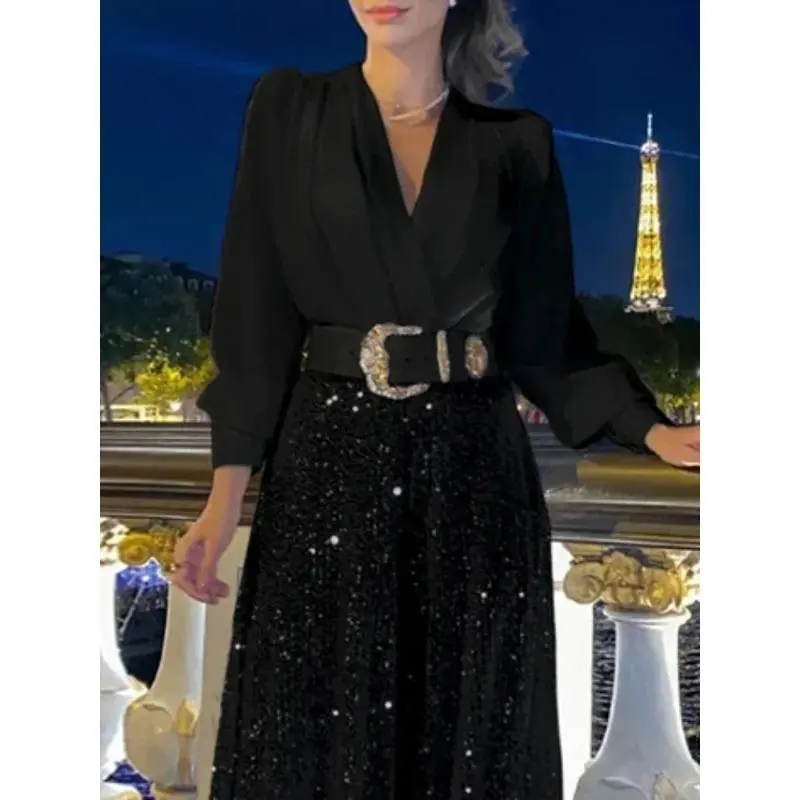 5. Splice Sequins Maxi Dresses For Women Fashion Folds Loose V Neck Elegant Dress Femme Party Evening Dresses Luxury 2024 Formal Womenswear Green Basic