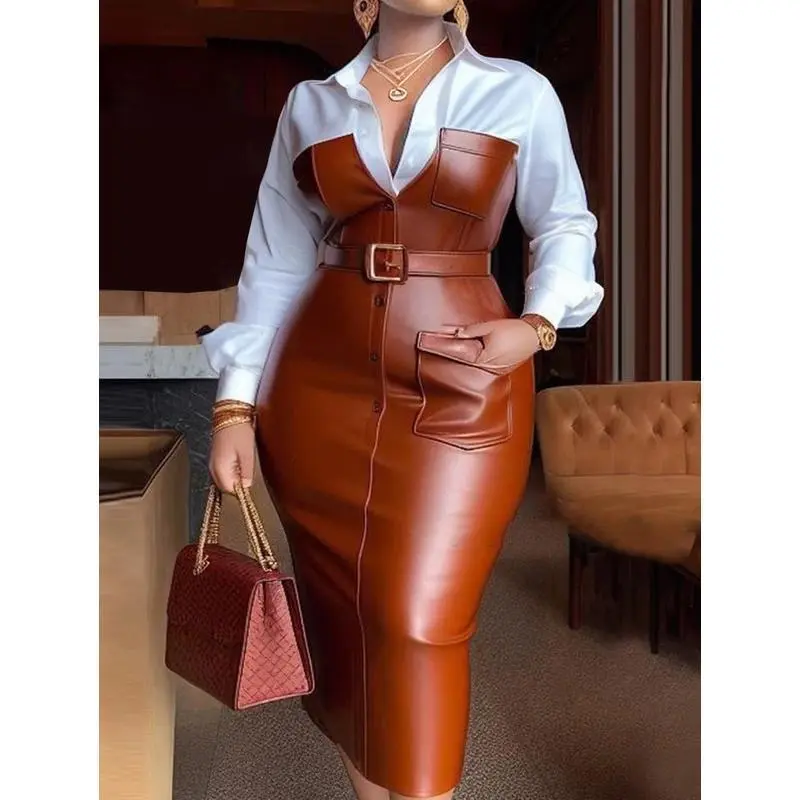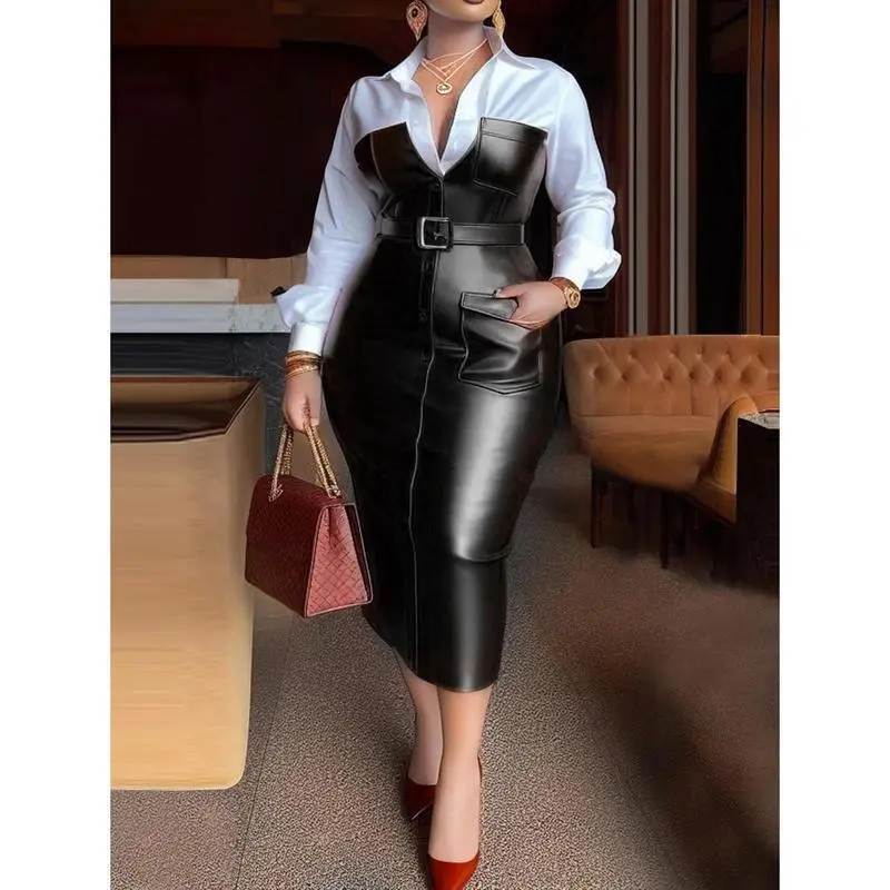 5. Womens Shirt Collar Dresses New Autumn Buttons Long Sleeve PU Leather Patchwork Pocket Skinny Belted Lapel Female Midi Dress