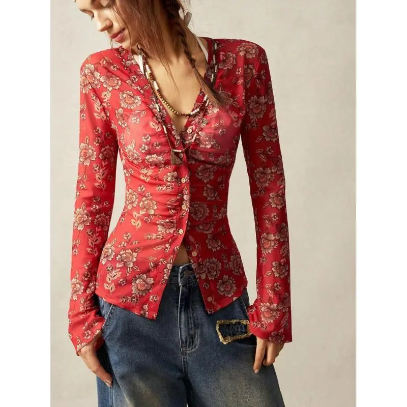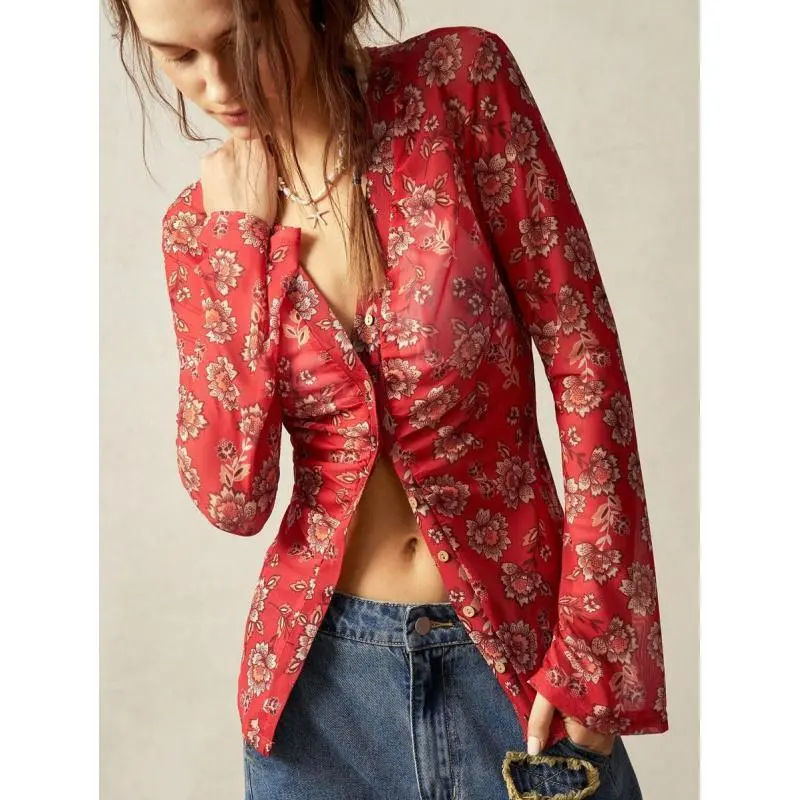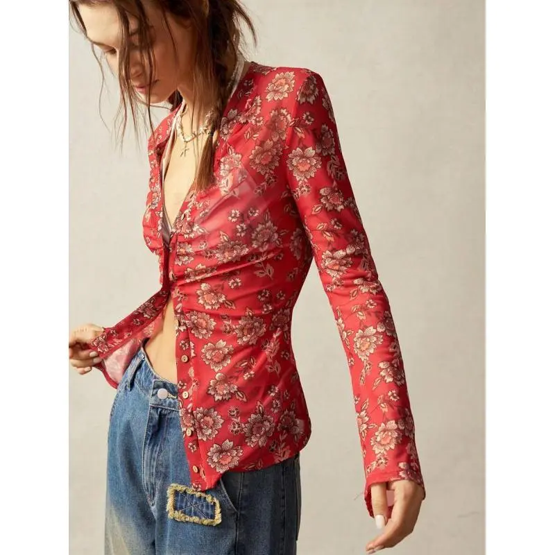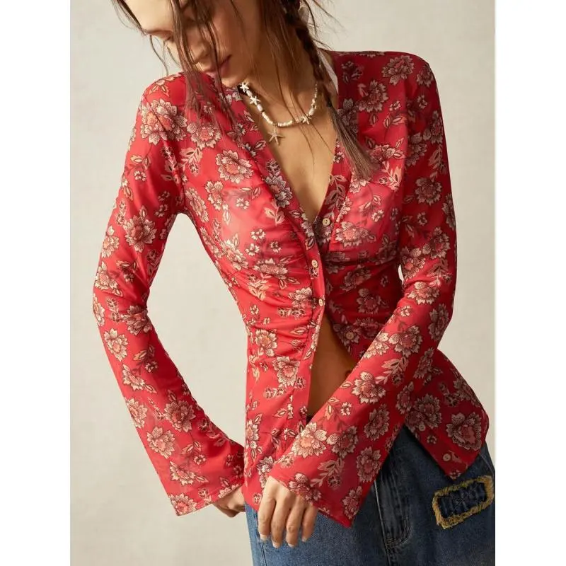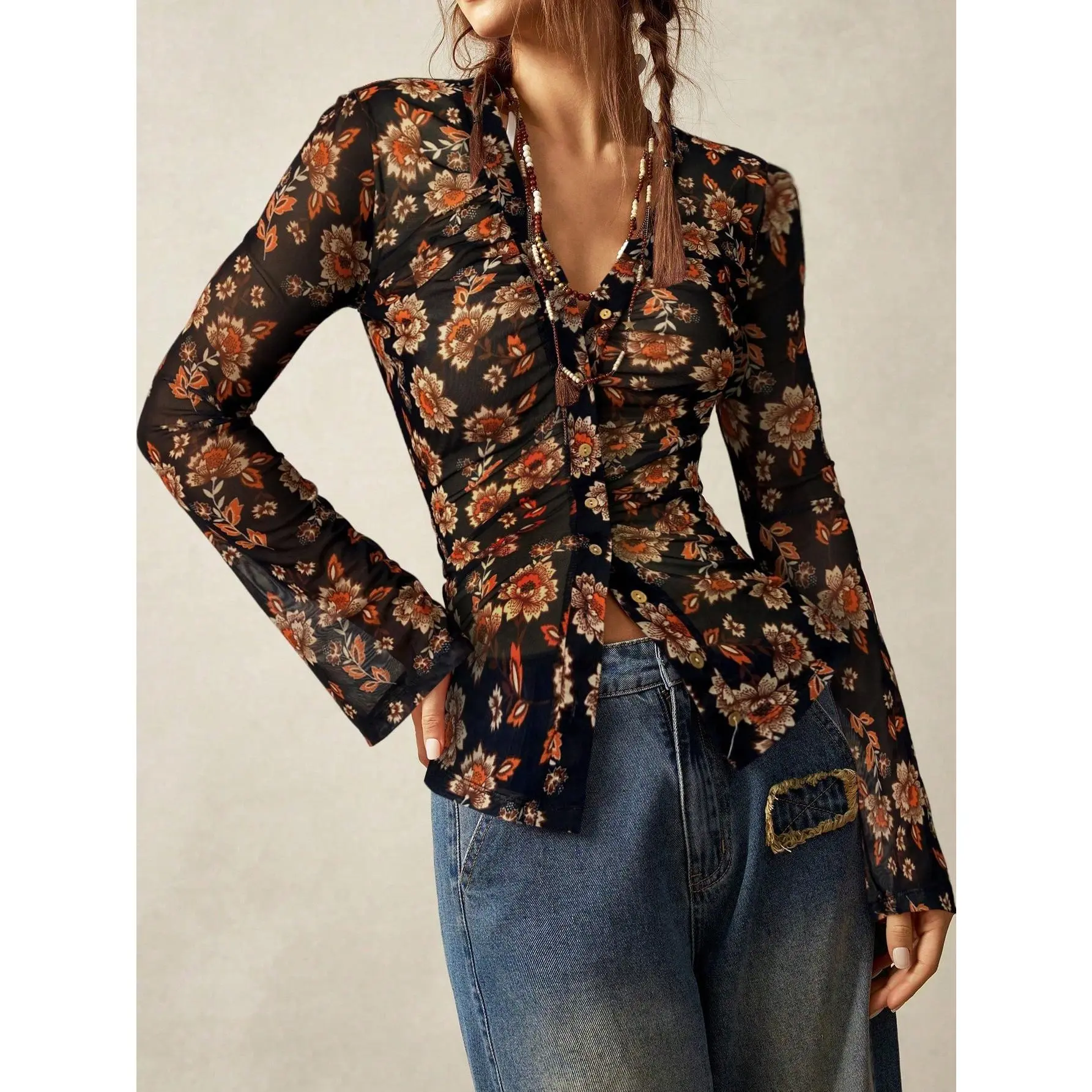 Sleeve Type:Regular Sleeve Details:Button, Ruched, Sheer Lined For Added Warmth:No Pattern Type:Floral, Plants, All Over Print Sleeve length: long sleeve Fit Type:Slim Fit Fabric Elasticity:Medium Stretch Composition:94% Polyester, 6% Elastane Care Instructions:Machine wash, do not dry clean,wash with the soft detergent