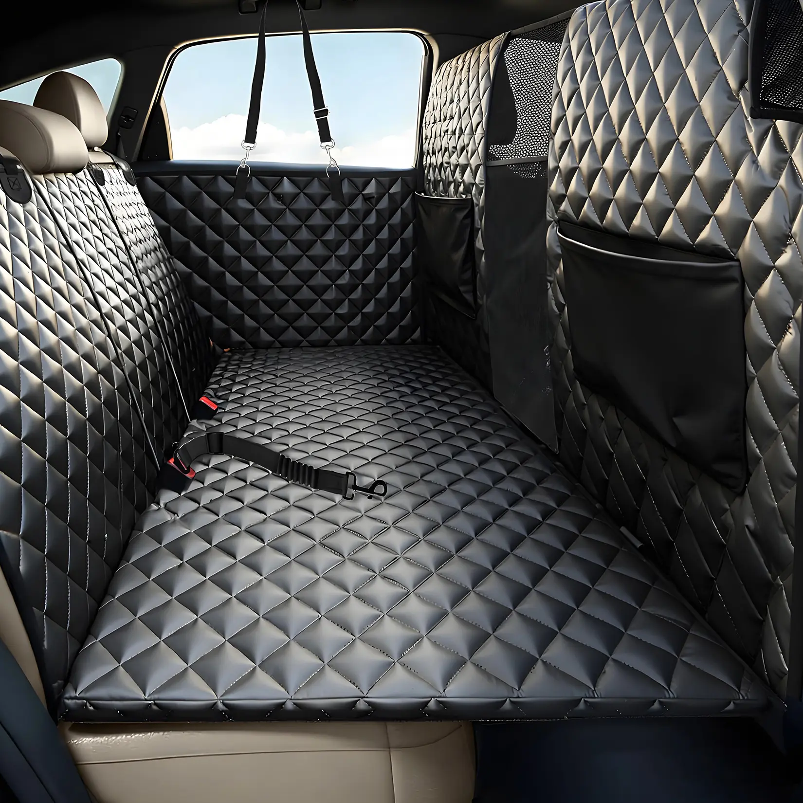 ·1.Transform Your Back Seat into a Pet Paradise: Upgrade your back seat into a spacious, sturdy play and rest area with this back seat extender for dogs. The 3 cm thick soft padding offers plenty of comfort for your energetic pup to stretch out, nap, or play, making long road trips a breeze