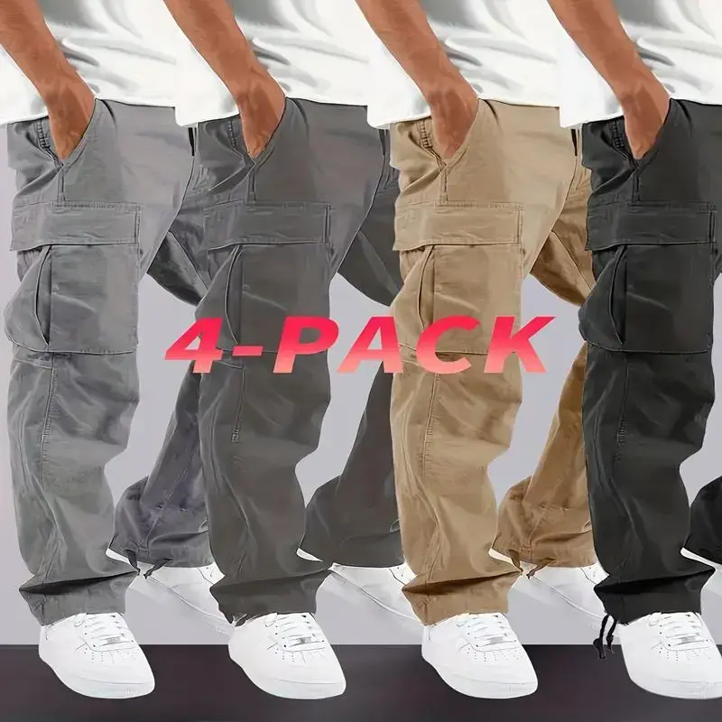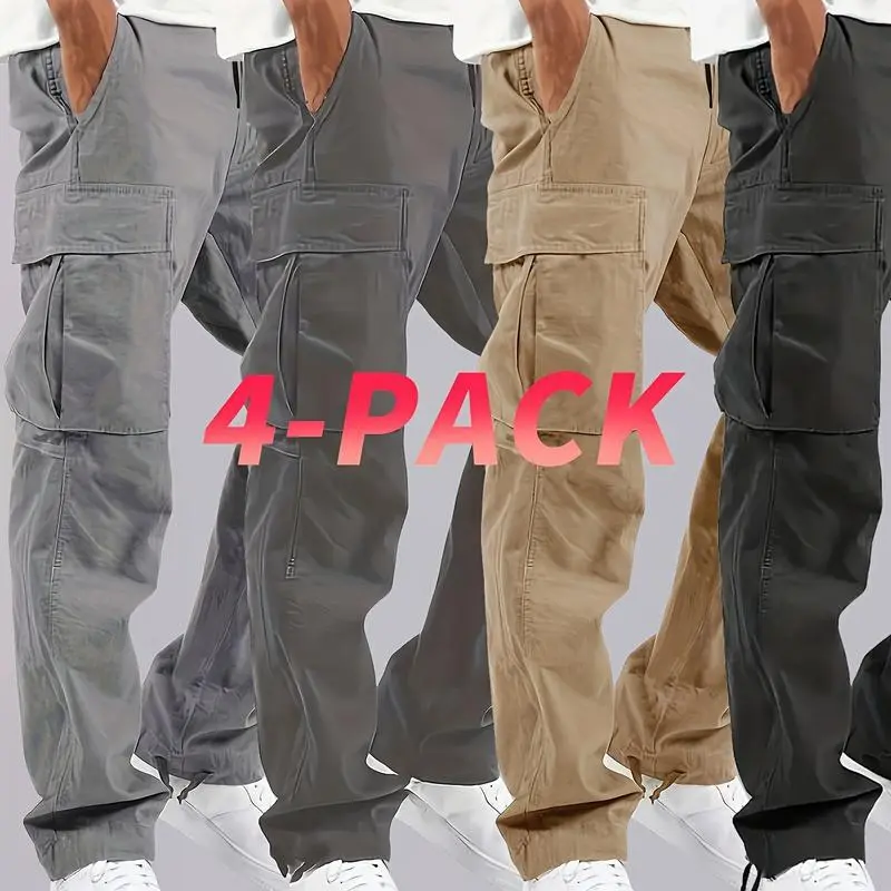 [Heavy-Duty Cargo Pants] 4pcs Men's Heavy-Duty Loose-Fit Pants | Elastic Drawstring Waist, Multiple Utility Pockets - Machine Washable Non-Stretch Fabric for Outdoor, Construction, Travel Available in Gray/Beige/Black Teens Casual
