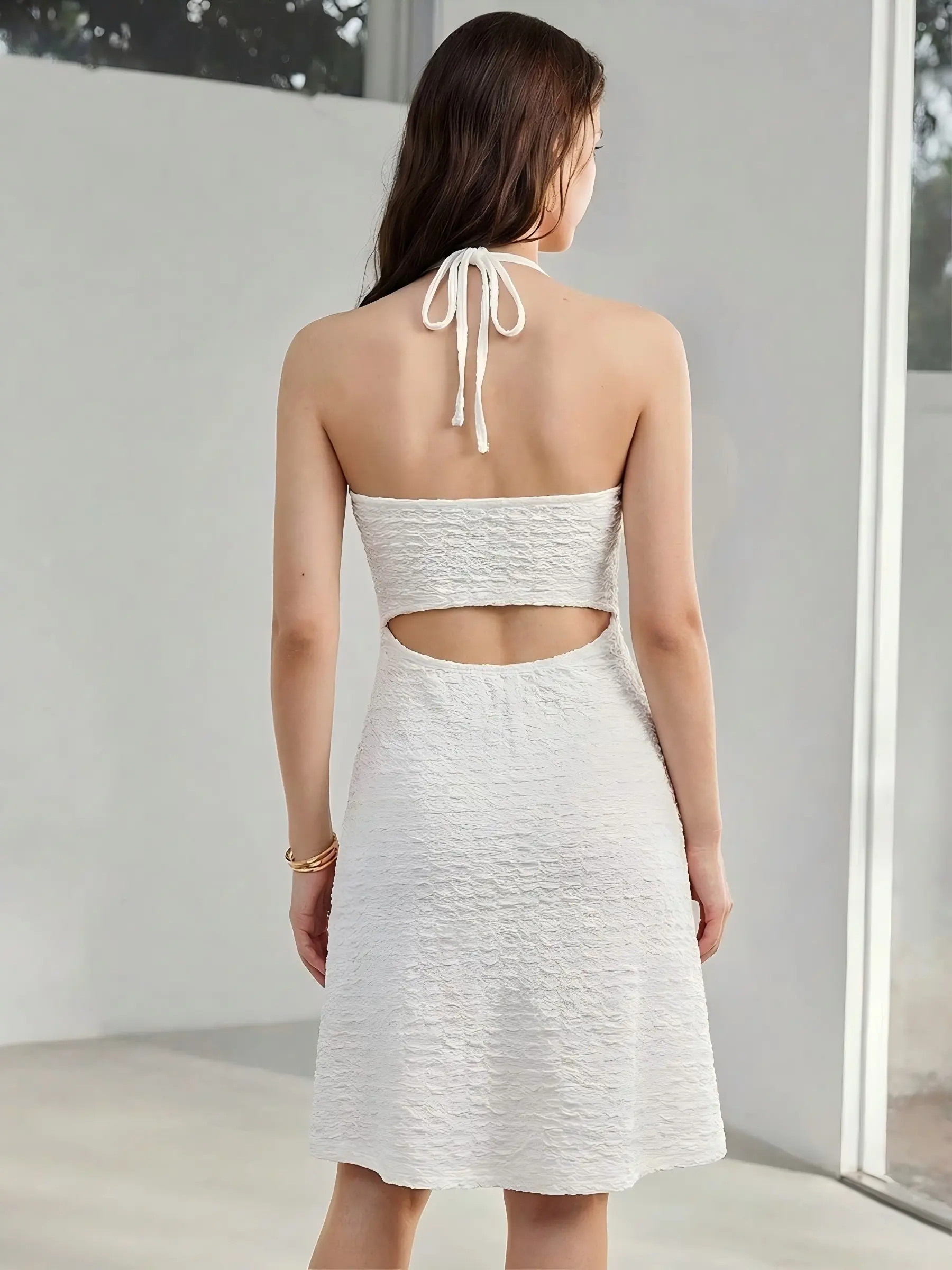 Title: White Textured Halter Midi Dress with Starfish Cutout Detail