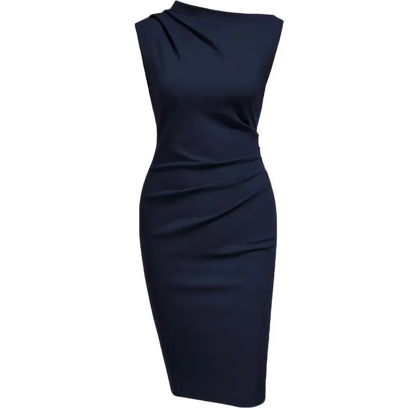 5. Women's Navy Blue Asymmetric Neckline Sleeveless Bodycon Pencil Dress - Mid-Length Machine Washable All-Season Elegant Office to Party Outfit, Smooth Fabric Formal Womenswear Workwear Basic Chic Crewneck