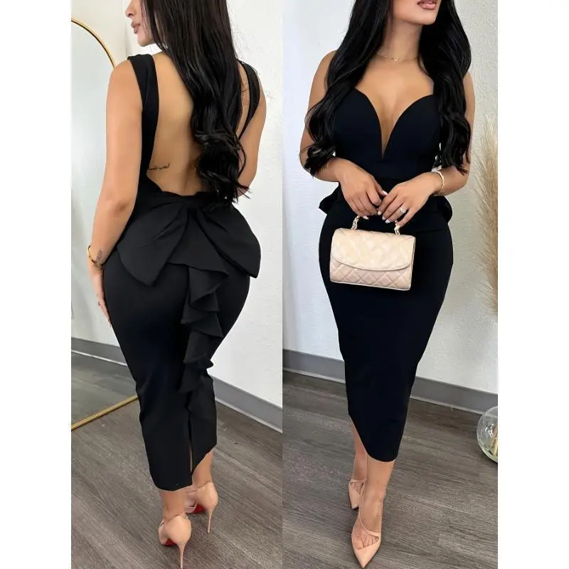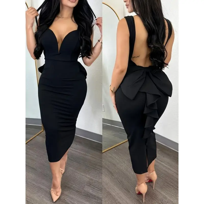 5. Women's Elegant Bridesmaid Dress - Sexy backless deep V-neck high waisted bow detail slim fit dress with asymmetrical slit Fabric Womenswear