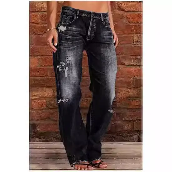Women's Ripped Jeans Mid Rise Straight Leg Denim Jean Plus Size Boyfriend Jeans Baggy Flare Pants 90s Hippie Clothes Casual Vintage