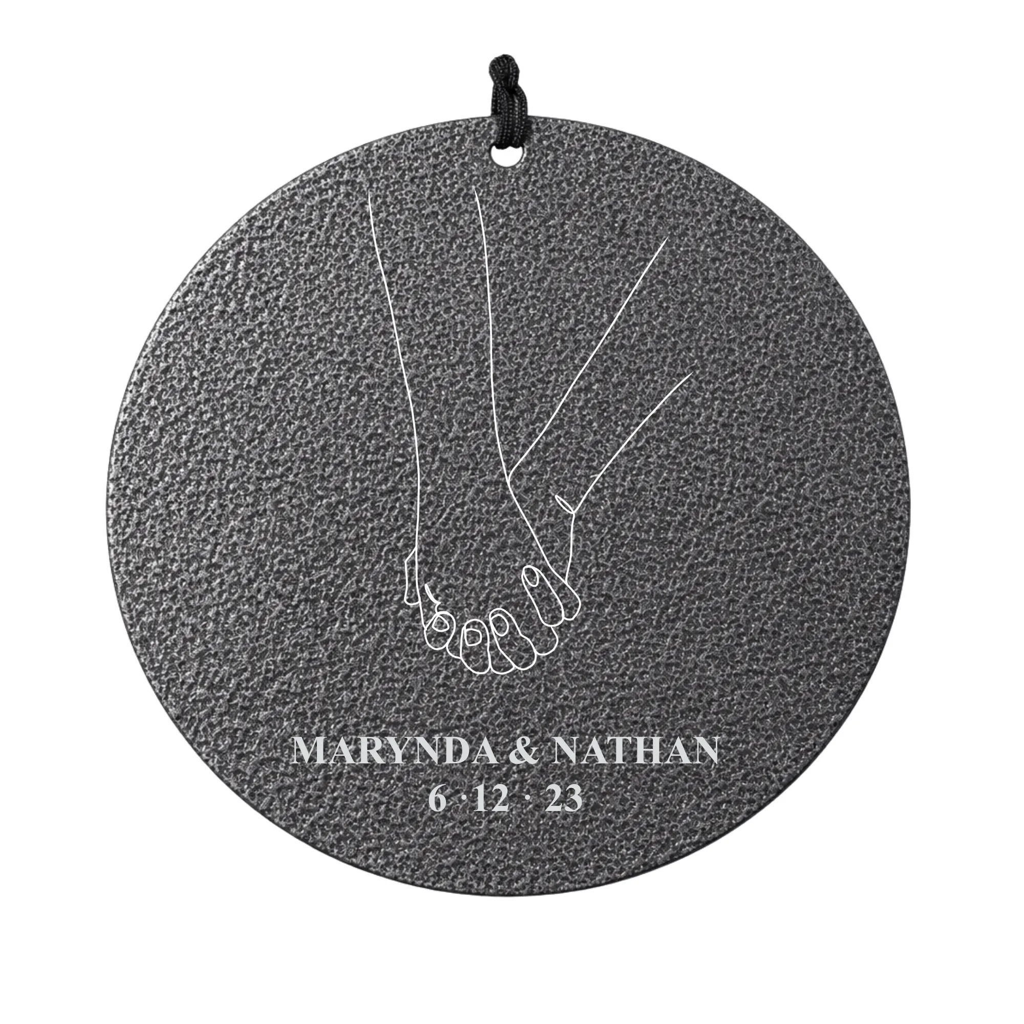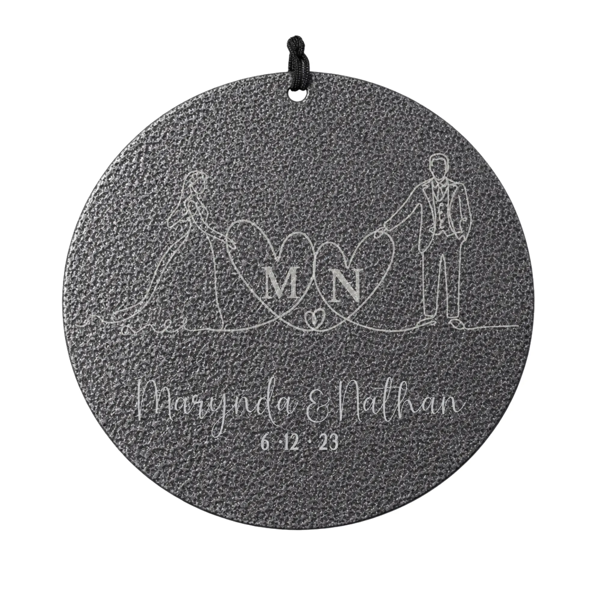A minimalist couple illustration engraved with names and date.