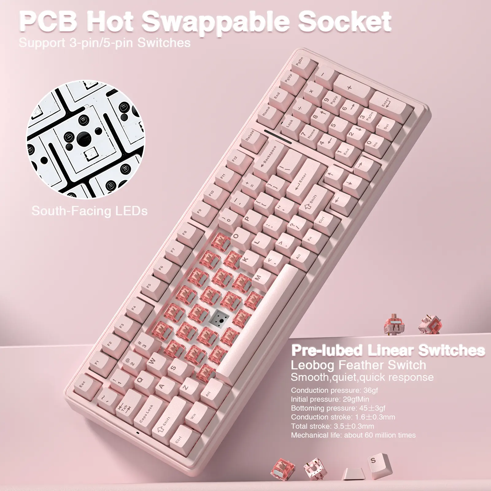 ·Hot-swappable Custom Keyboard: The switches and keycaps can be freely replaced(keycap/switch puller are included in the package).This customizable keyboard with hot-swap PCB allows users to replace 3 pins/5 pins switches easily without soldering issue. F99 mechanical keyboards equipped with pre-lubed linear switches, bring smooth typing feeling and pleasant typing sound, provide fast response for exciting game