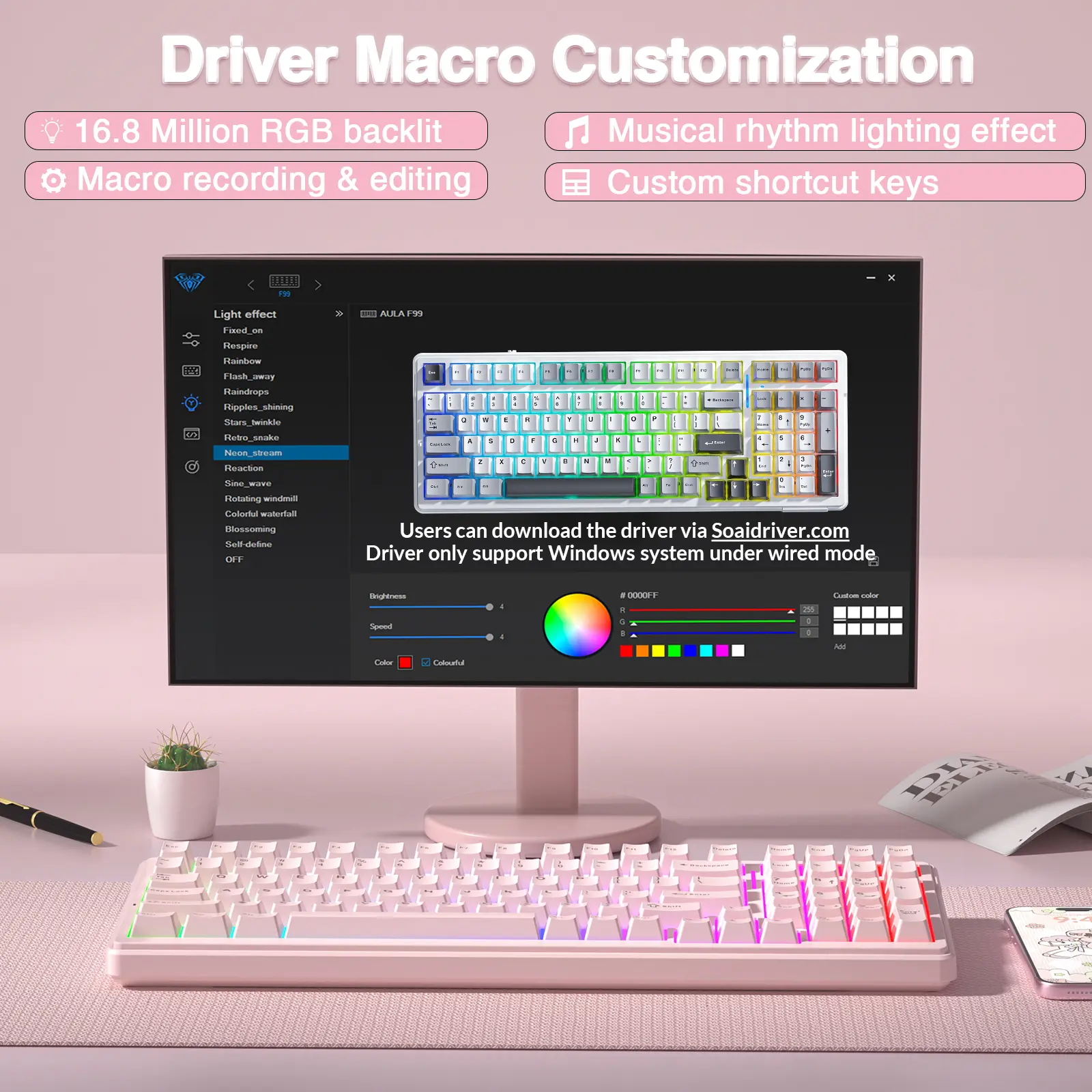 ·Mechanical Gaming Keyboard: F99 is a premium mechanical keyboard for both work and game. With 16 RGB lighting effect to adds a great atmosphere to the game room. All keys support macro customization, which allows macro recording and editing, customize key function and 16.8 million light colors, and supports cool music rhythm lighting effects with driver. N-key rollover, keyboard can respond to multiple key presses at the same time, which is helpful in very exciting real-time games