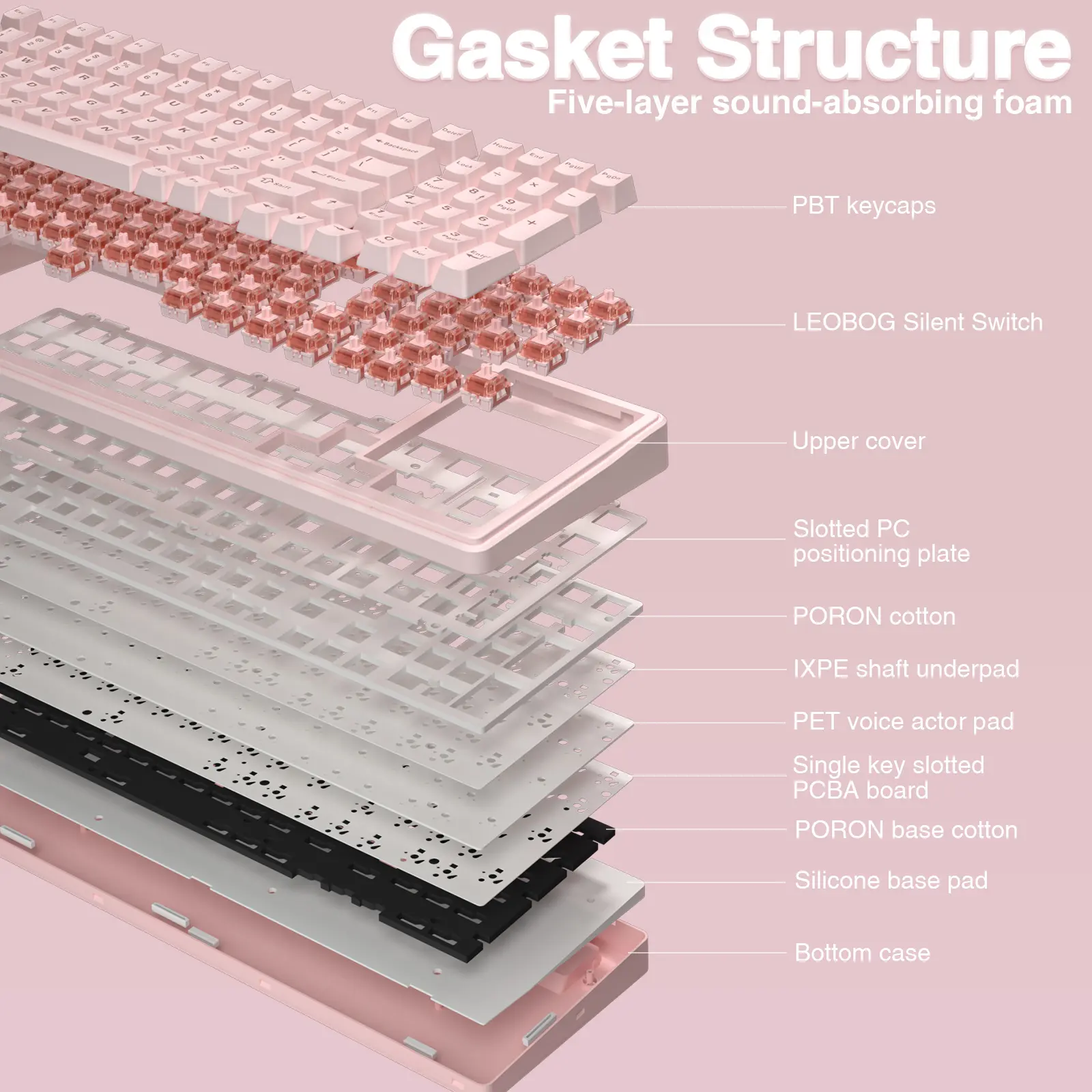 ·Gasket Structure and PCB Single Key Slotting: This computer keyboard features a gasket structure, extended integrated silicone pad, and PCB single key slotting, better optimizes resilience and stability, making the hand feel softer and more elastic. Five layers of filling silencer fills the gap between the PCB, the positioning plate and the shaft,effectively counteracting the cavity noise sound of the shaft hitting the positioning plate, and providing a solid feel