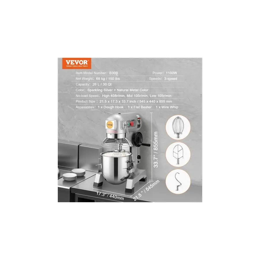 VEVOR Commercial Food Mixer, 30Qt Commercial Mixer with Timing Function, 1100W Stainless Steel Bowl Heavy Duty Electric Food Mixer Commercial with 3 Speeds Adjustable 108/199/382 RPM, Dough Hook WhiskVEVOR Commercial Food Mixer, 20Qt Commercial Mixer with Timing Function, 750W Stainless Steel Bowl Heavy Duty Electric Food Mixer Commercial with 3 Speeds Adjustable 108/199/382 RPM, Dough Hook Whisk