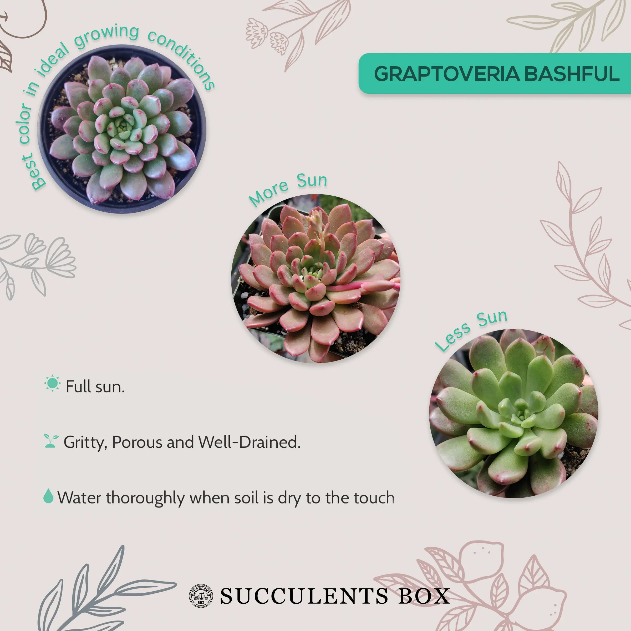 · Graptoveria Bashful is a sun loving succulent with stemless, clump-forming rosettes up to 3 inches (7.5 cm) in diameter, of thick, chubby and minty green leaves. It turns a bright, translucent pink from direct sunlight and cool temperatures. If growns in the shade, it will lose that coloration and fade to its original green. The flowers are pink and appear on long arching stems. Plants may be shipped bare root.