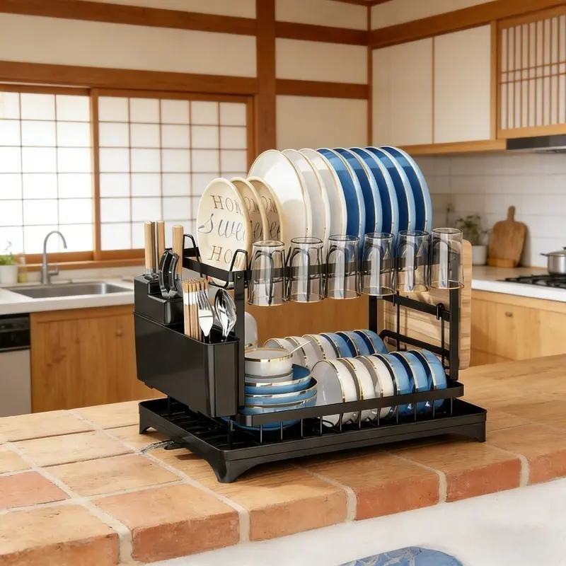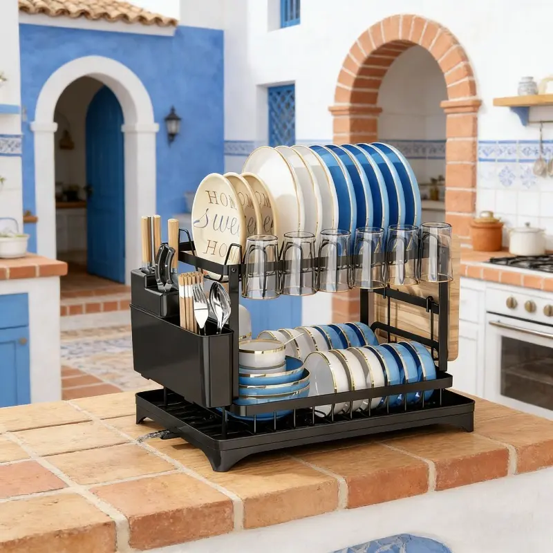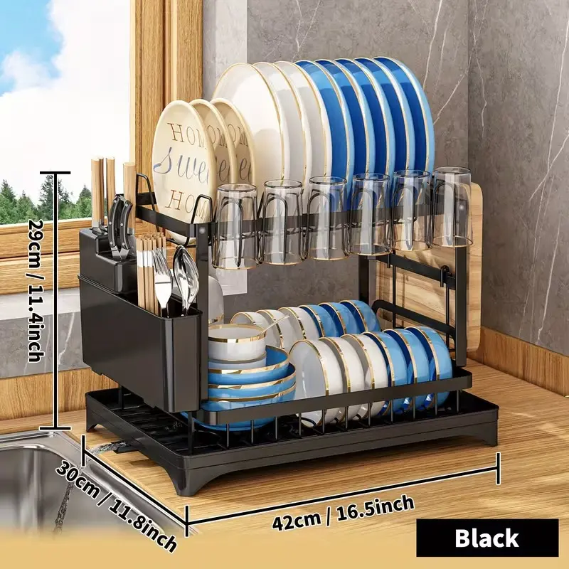 Double drain rack, kitchen countertop dish rack, kitchen accessories with drain tray and cutlery rack