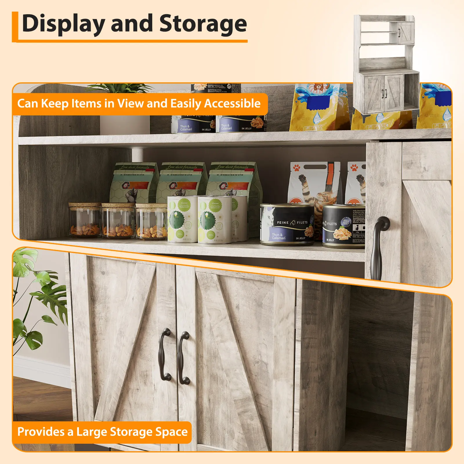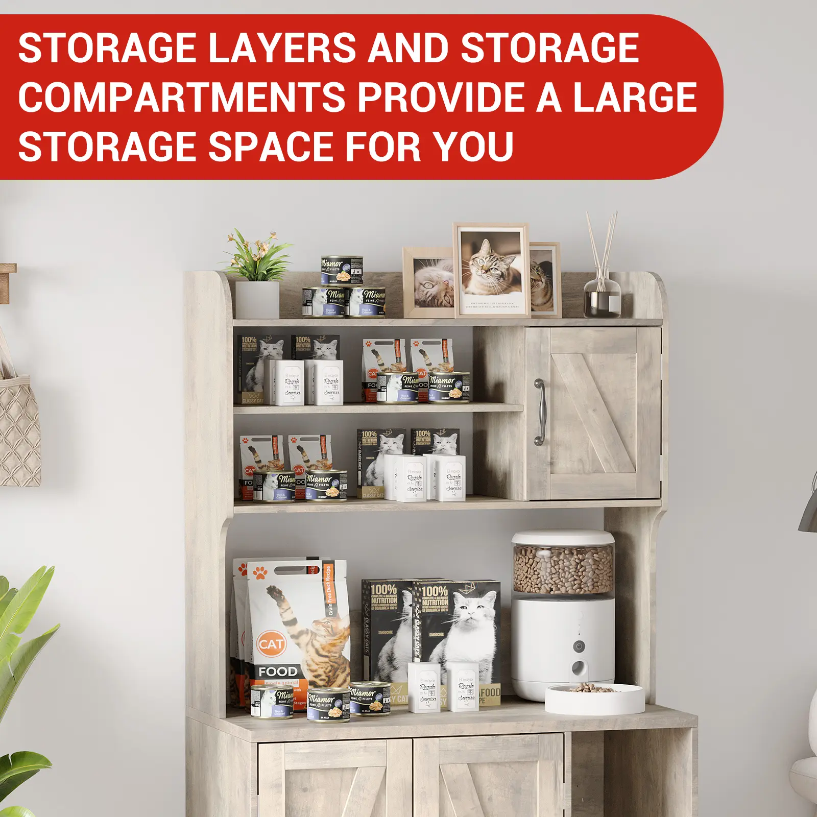 ·Ample Storage: Features four-tier shelves and a right-side compartment, perfect for storing cat food, toys, grooming tools, and daily basic, keeping your space tidy and organized.