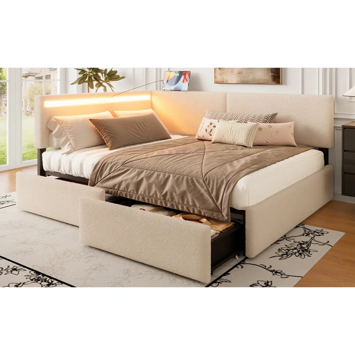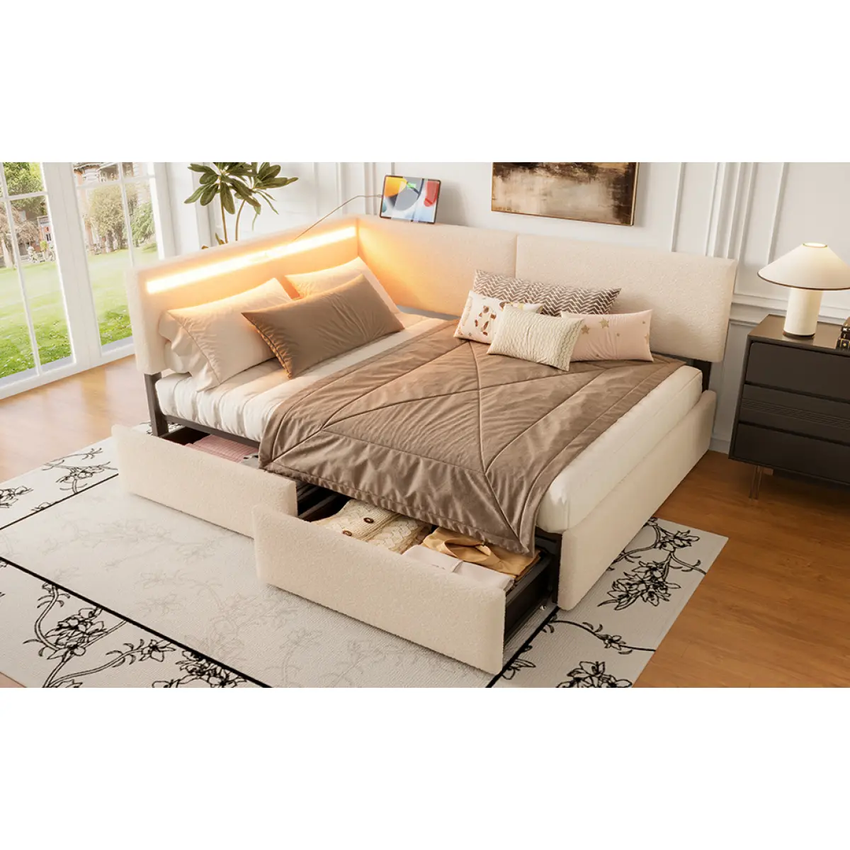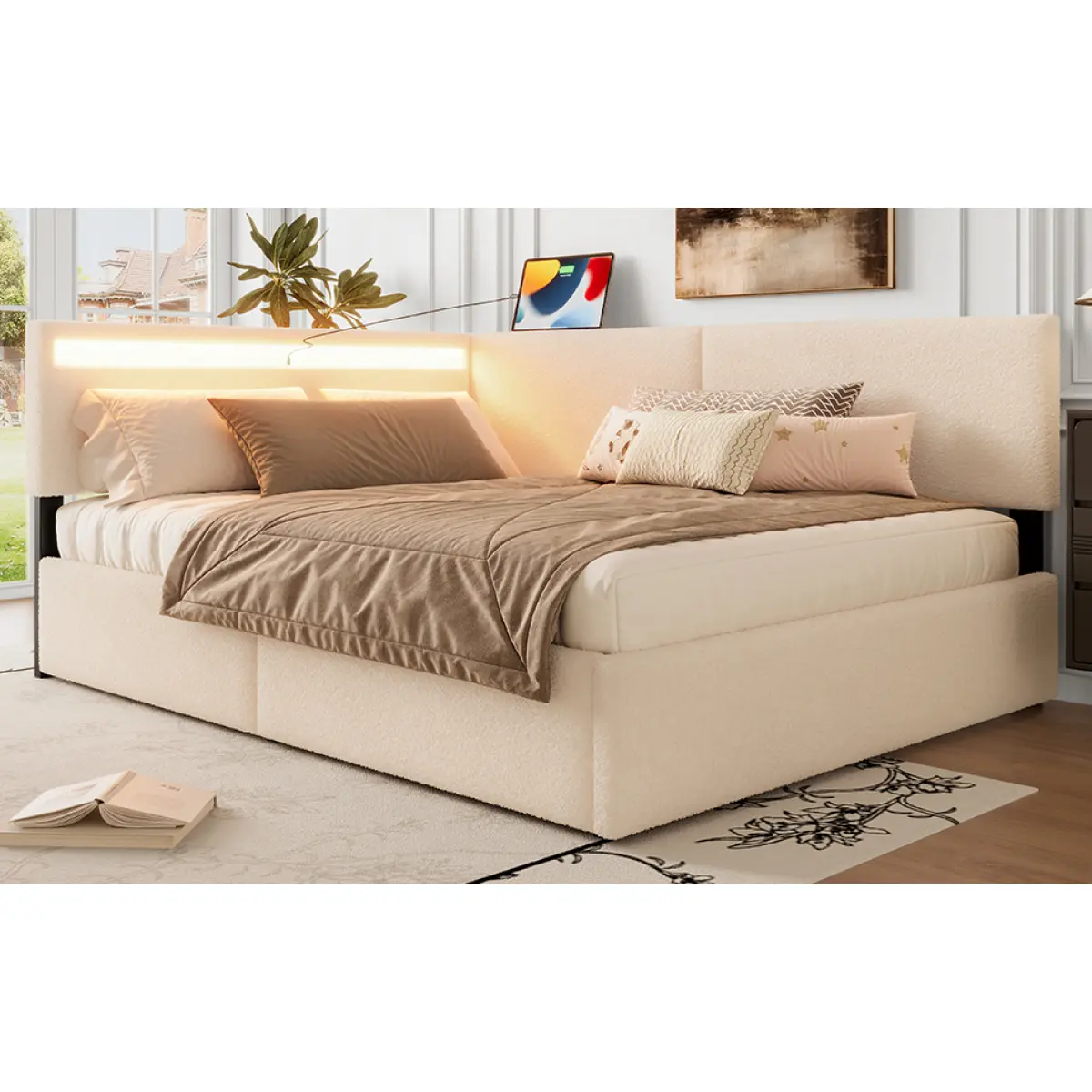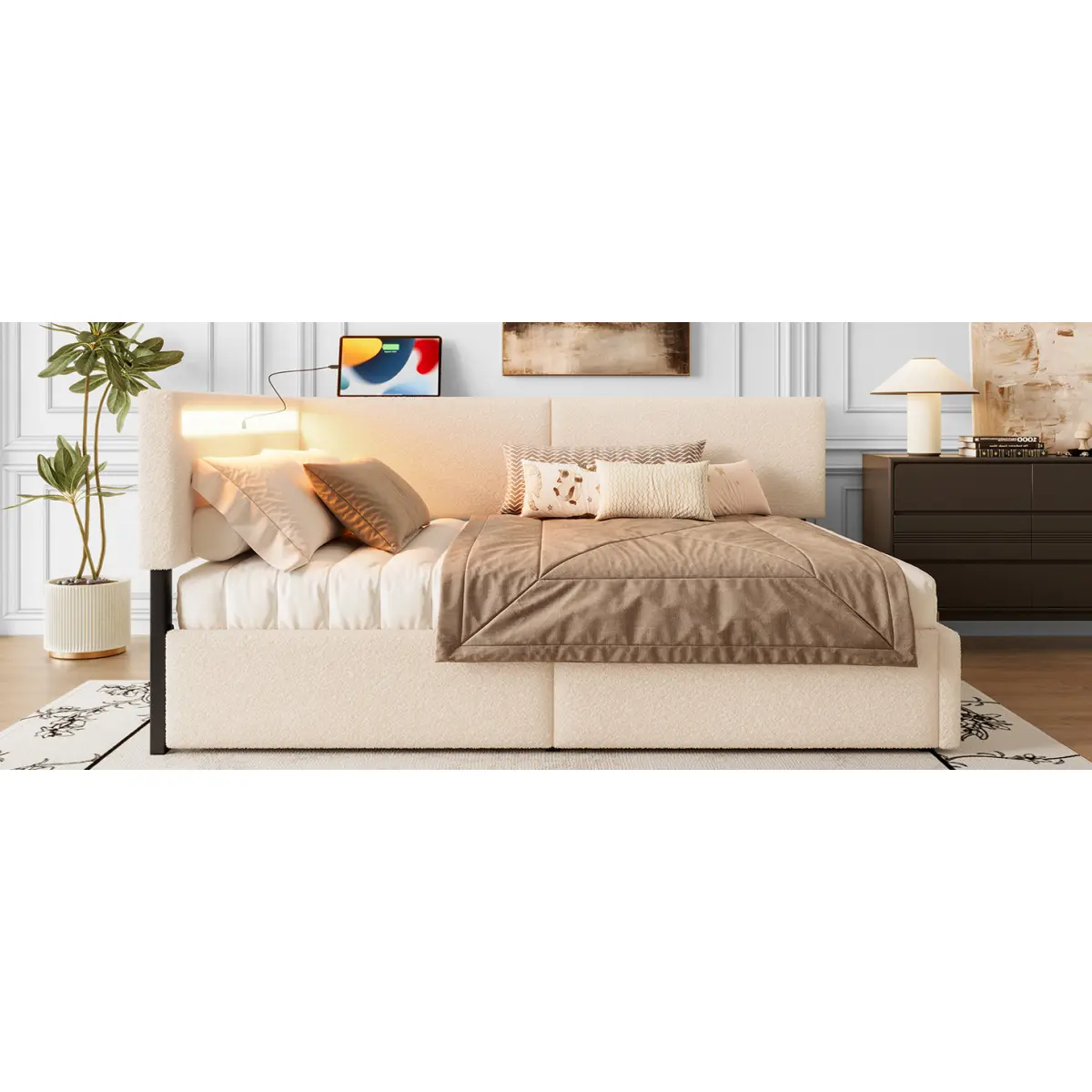 ItemCode:W1670P410460Product Type:SingleBoxProduct name:TwinSizeBoucleBedFrame,UpholsteredCloudBedFramewithHeadboard,with2StorageDrawers,LEDlightandUSBChargingDesign,SolidWoodLegsandSlats,NoBoxSpringNeeded,Beige color:Beige material:Fleece bed dimensions:Twin