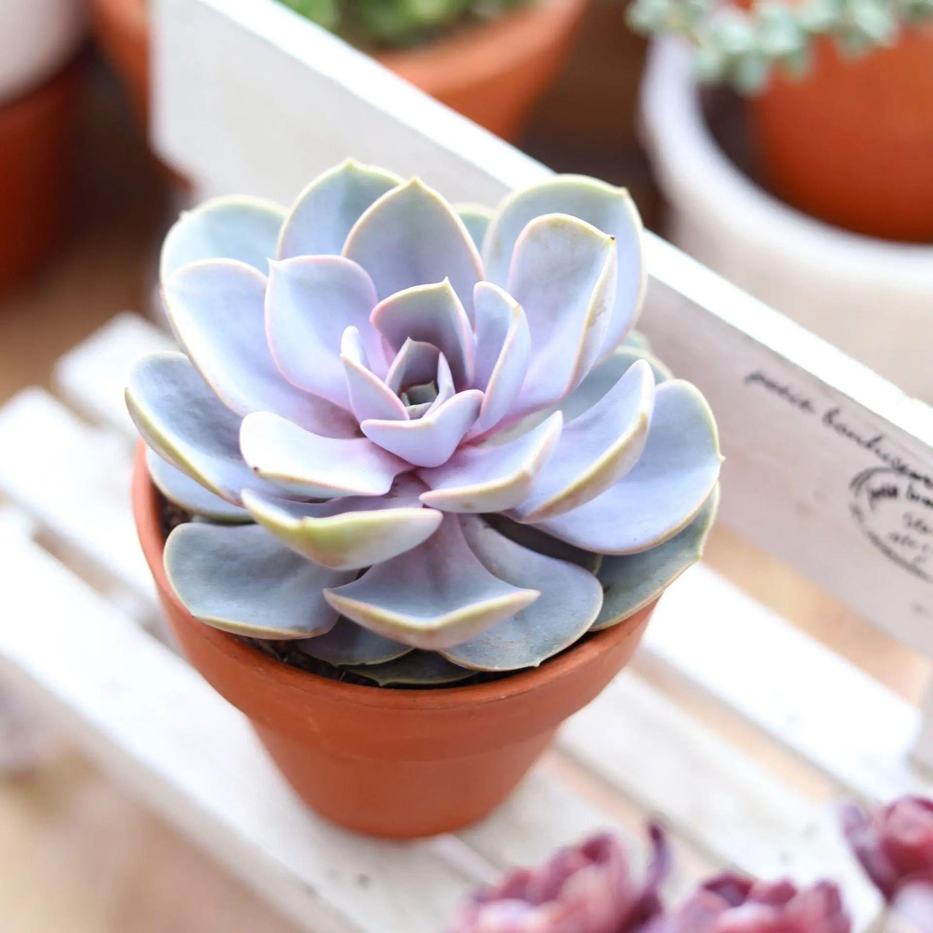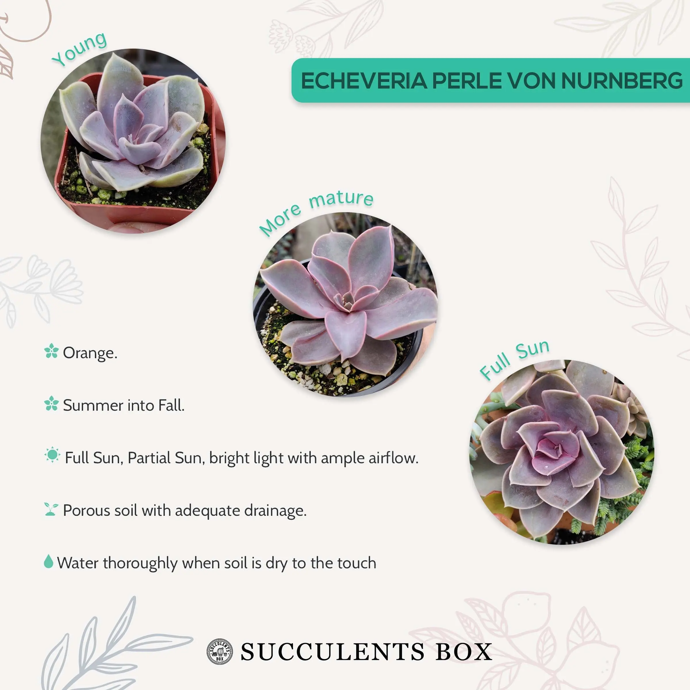 · This succulent is a beautifully colored Echeveria Perle Von Nurnberg. The plant is a hybrid of E. Gibbiflora v. Metallica and E. Potosina. These plants are excellent for windowsill culture or as color accents in rock gardens or dish gardens. These make super colorful favors. Create your own container garden or centerpiece using the very popular succulents or buy in bulk to use these as wedding or party favors. All of the plants may be shipped bare root.