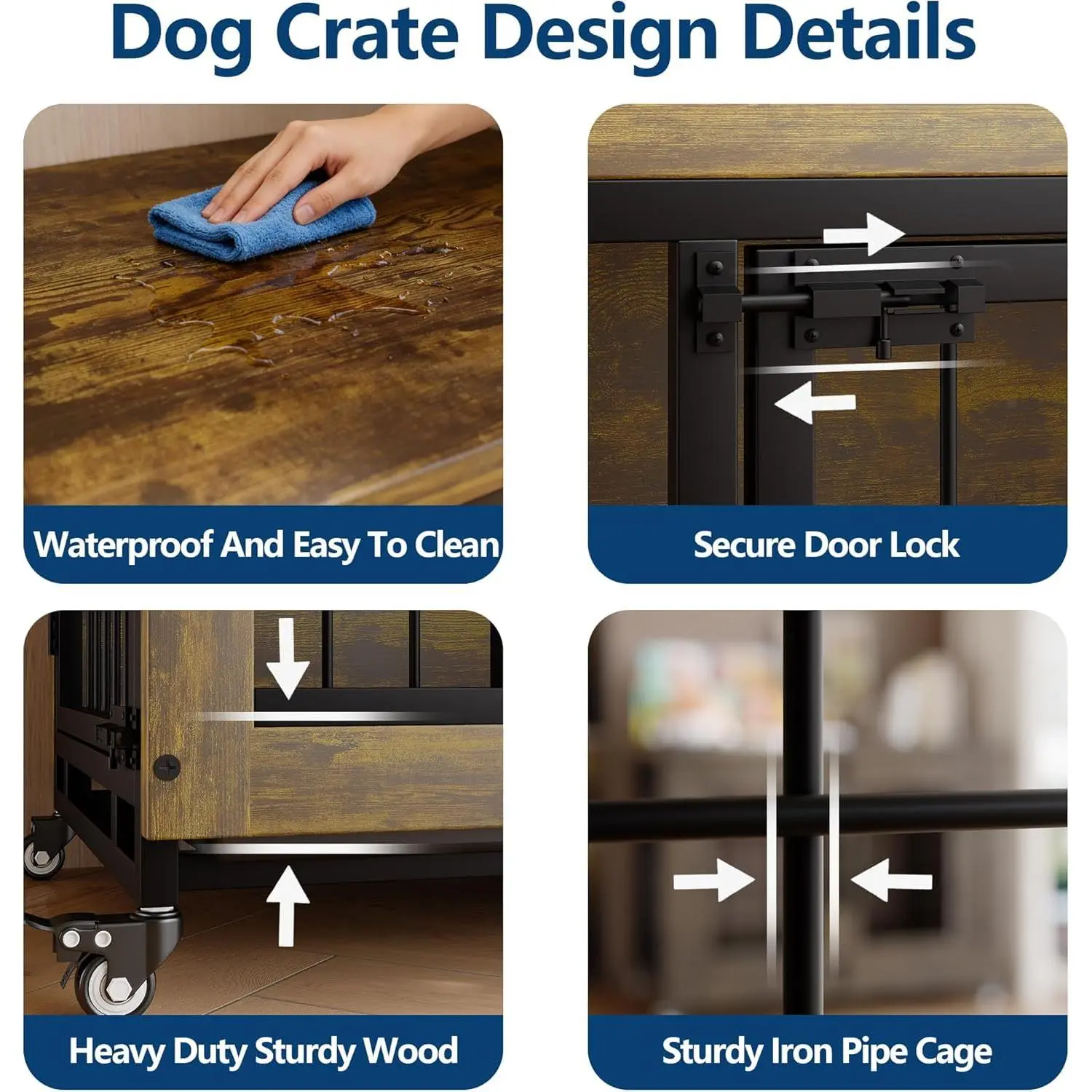 ·1.【Dual-Purpose Dog Crate & Side Table】 This rustic-style crate serves as both a secure indoor kennel and a functional furniture piece, with a flat top perfect for use as an end table or displaying decor.