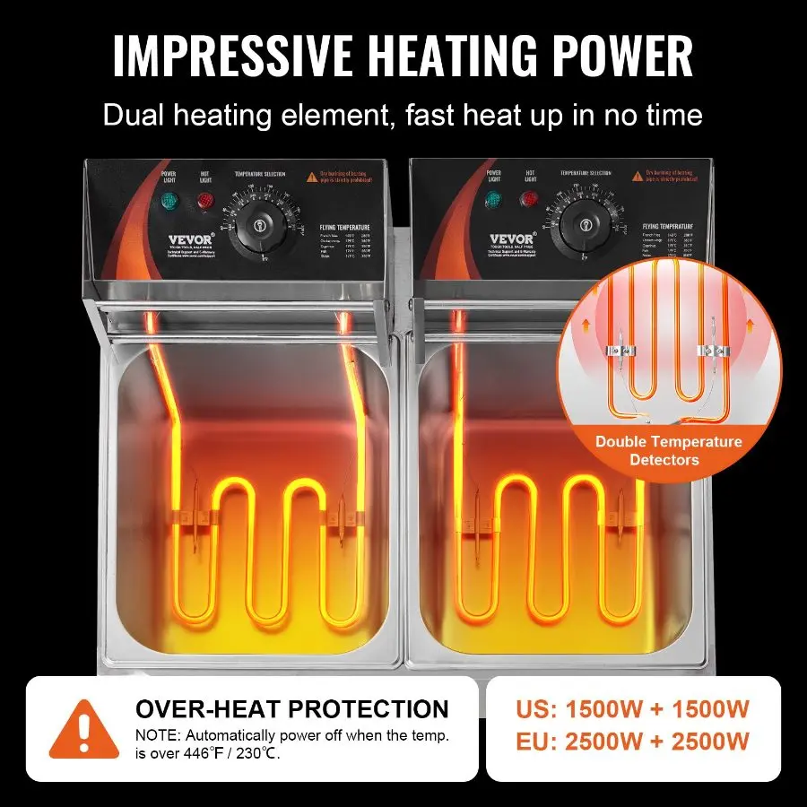VEVOR Commercial Deep Fryer, Dual Tank 3000W Electric Countertop Fryer with Basket, 2x 11.6Qt/11L Double Stainless Steel Oil Fryer with Oil Filtration, Time Temp Control, for Kitchen Restaurant UseVEVOR Commercial Deep Fryer, Dual Tank 3000W Electric Countertop Fryer with Basket, 2 x 9.1Qt/8.6L Double Stainless Steel Oil Fryer, with Temp Control & Overheat Protection, for Kitchen Restaurant Use