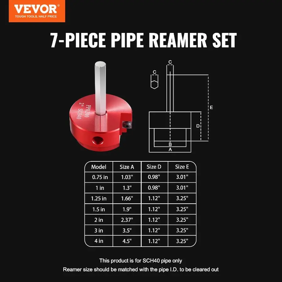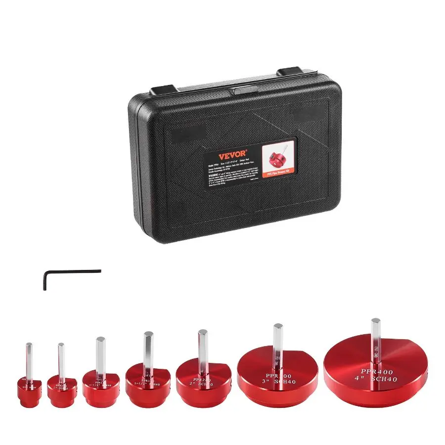 VEVOR 4Pcs PVC Pipe Reamer Kit, Plastic Pipe Fitting Socket Saver Tool Kit, Includes 1-1/2, 2, 3, 4, for PVC, CPVC, and ABS Fittings, with Tool Box, for Exhaust, Drain, Water Pipes CleaningVEVOR 7Pcs PVC Pipe Reamer Kit, Plastic Pipe Fitting Socket Saver Kit, Includes 3/4", 1", 1-1/4'', 1-1/2", 2", 3", 5'', for PVC, CPVC, and ABS Fittings, for Exhaust, Drain, Water Pipes Cleaning