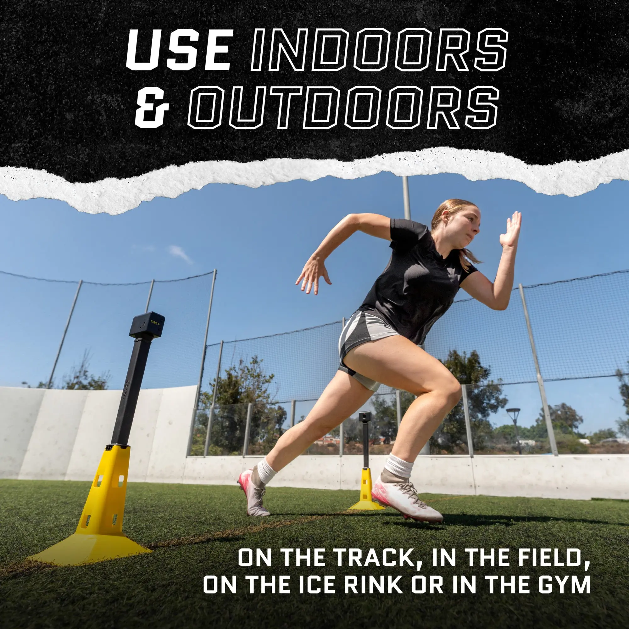 The Speed Gates Pro is designed for accurate, reliable speed and agility timing across a wide range of training environments. With four radio frequency sensors, it records times up to 50 yards, making it ideal for drills such as the 40-yard dash. Setup is simple with alignment lights confirming correct connection, and extension poles ensuring sensors are tall enough to prevent misreads. The LED timer is bright and visible both indoors and outdoors, allowing use on the track, in the field, in the gym, or on the ice. Timer memory stores up to 50 recent results, letting athletes and coaches review and compare times. Gate placement is versatile, whether for straight sprints, laps around a rink, or running the bases. The Speed Gates Pro also includes rechargeable lithium batteries and a charging cable, eliminating the need to purchase disposable batteries. When training is finished, all components fit into the included carry bag for convenient transport. With start and finish cones, sensors, timer, extension poles, and power accessories, the Speed Gates Pro offers a complete timing solution for performance measurement.
