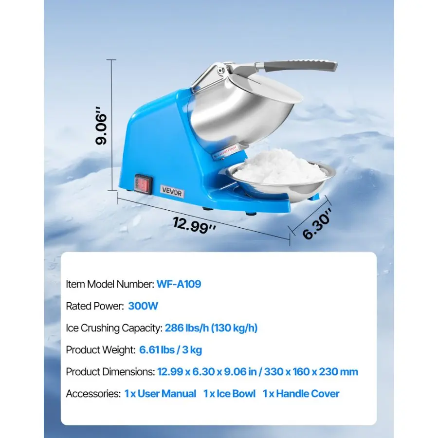 VEVOR Ice Crusher Machine, 440lbs Per Hour Electric 4 Blades Snow Cone Maker, All Stainless Steel Shaved Ice Machine with Bowl and Cover, 350W 1400RPM Ice-Shaver for Home and Commercial Use, SilverVEVOR Ice Crusher Machine, 286lbs Per Hour Electric 4 Blades Snow Cone Maker, Stainless Steel Shaved Ice Machine with Bowl and Cover, 300W 2000RPM Ice-Shaver for Home and Commercial Use, Blue