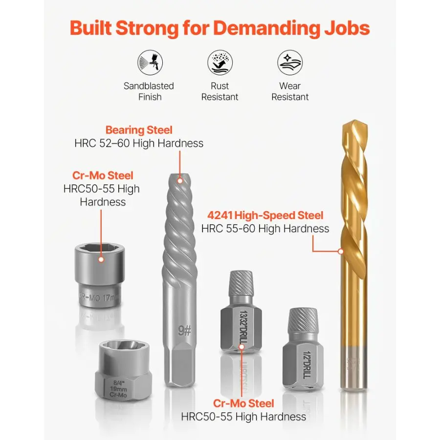 VEVOR Screw Extractor Set, 63 Pieces, with Nut and Bolt Extractors, Nut Splitters, Taps, Drill Bits, Wrenches, Adapters, and Solid Storage Case, for Removing Rounded, Broken, or Stripped FastenersVEVOR Screw Extractor Set with Drill Bits, 65 Pieces, Easy Out Nut Bolt Extractors and Drill Bits, with Adapters, Solid Storage Case, Cr-Mo Steel for Removing Rounded, Broken, or Stripped Fasteners