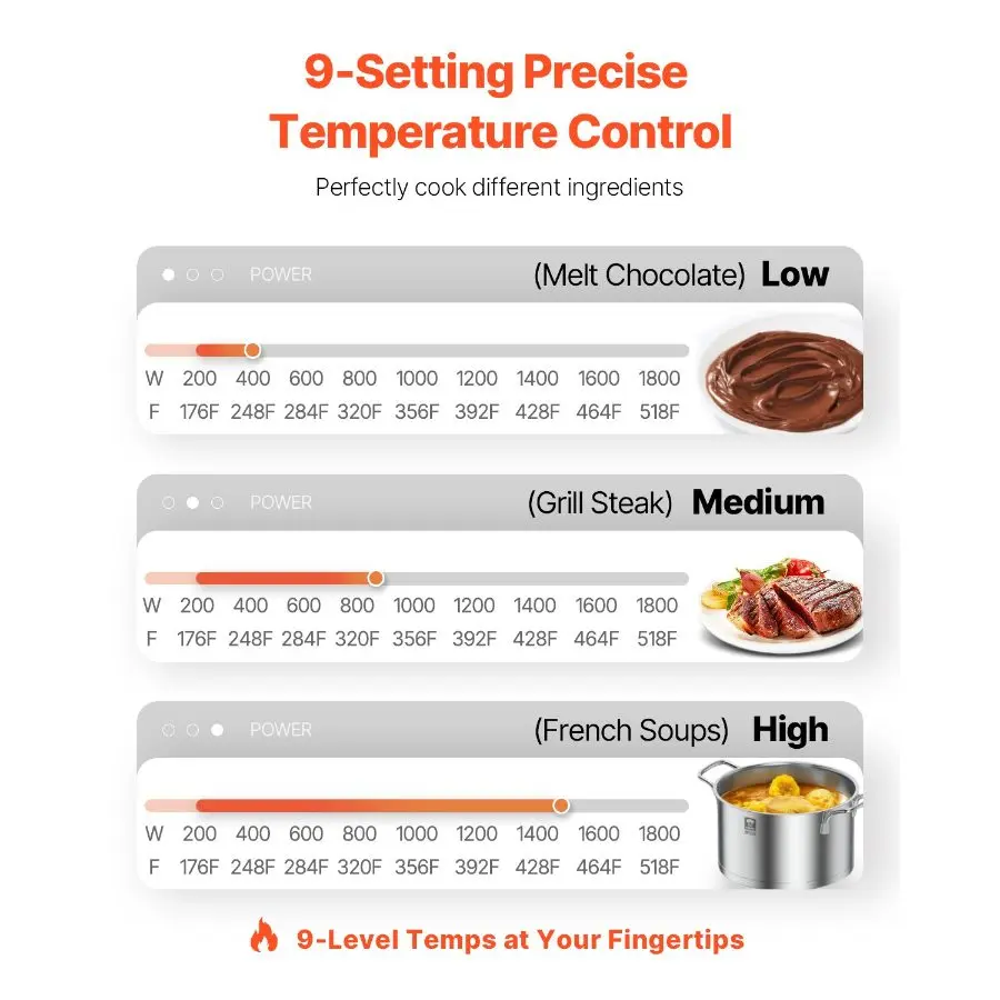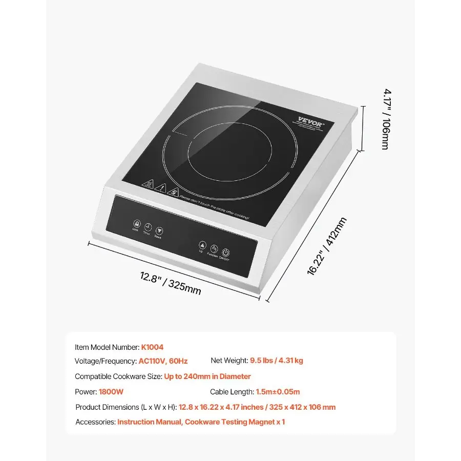 VEVOR Portable Induction Cooktop, 1800W Commercial Induction Burner with 9 Temperature Settings, Stainless Steel Countertop Induction Hot Plate with 3H Timer, Child Lock, for Restaurant CookingVEVOR Portable Induction Cooktop, 1800W Commercial Induction Burner with 9 Temperature Settings, Stainless Steel Countertop Induction Hot Plate with 3H Timer, Child Lock, for Restaurant Cooking