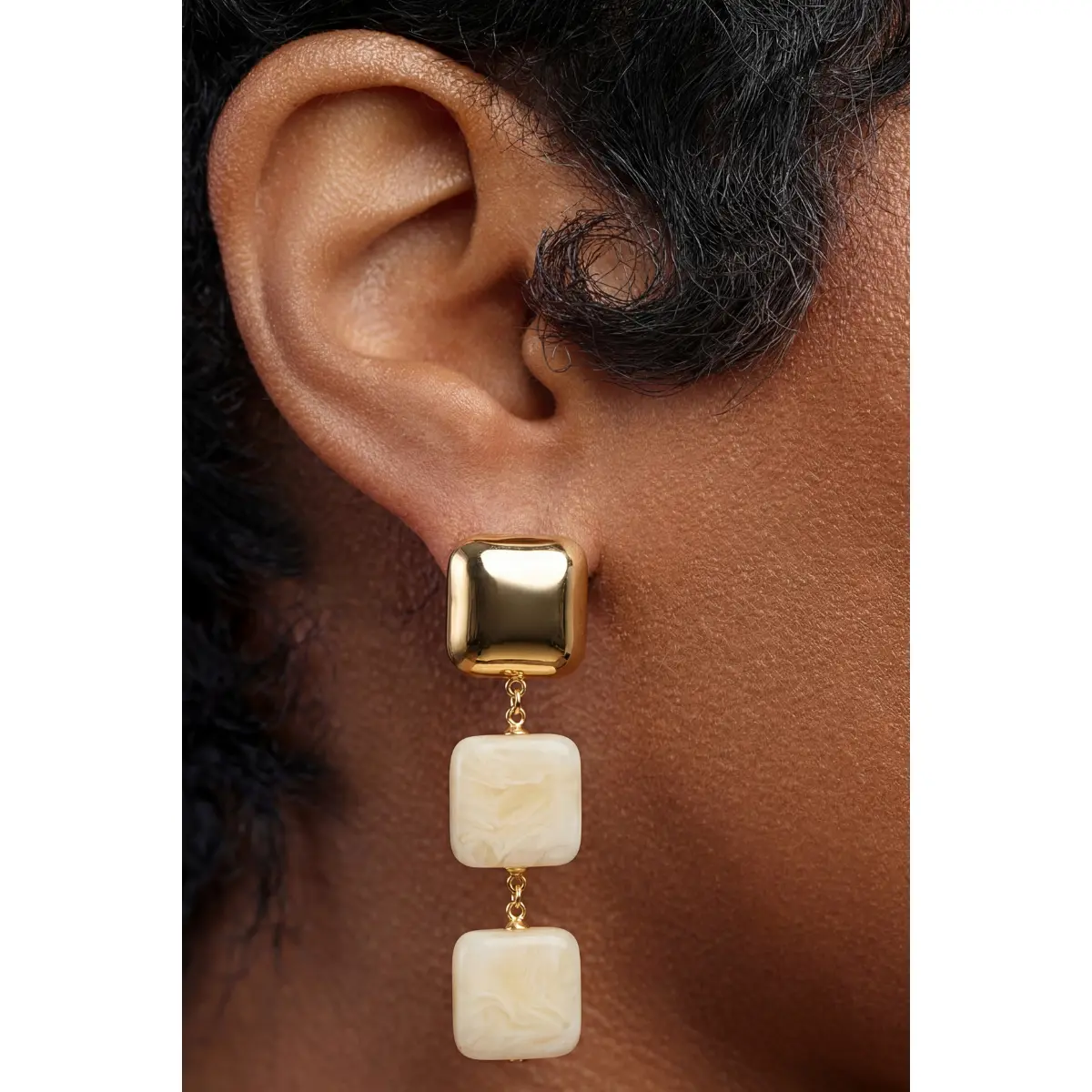 These editorial drop earrings feature a polished chunky gold square stud connected to two ivory marble resin square pendants, linked by delicate gold chain for a sleek, tiered silhouette. The creamy marbled finish adds a rich, luxurious texture that elevates any outfit.