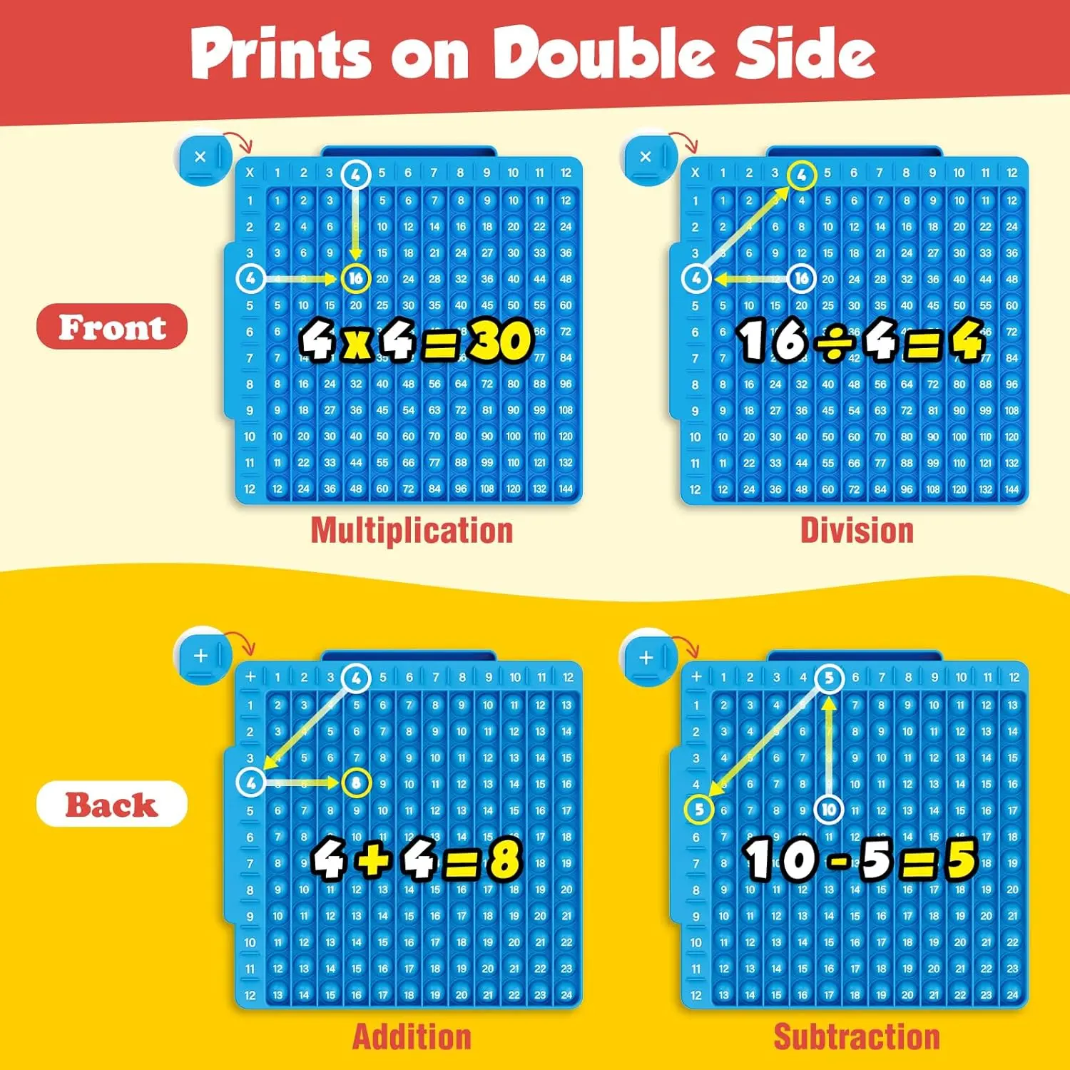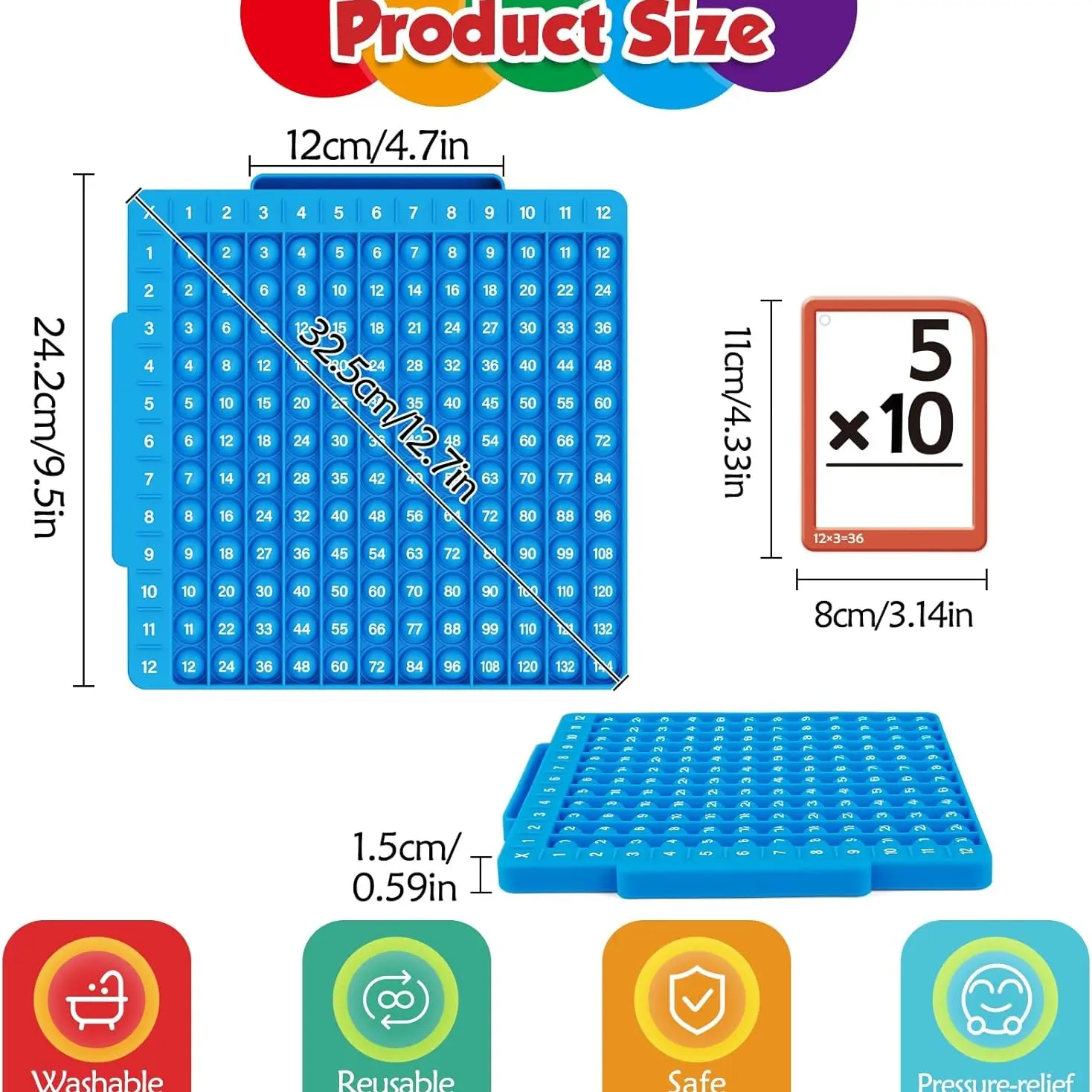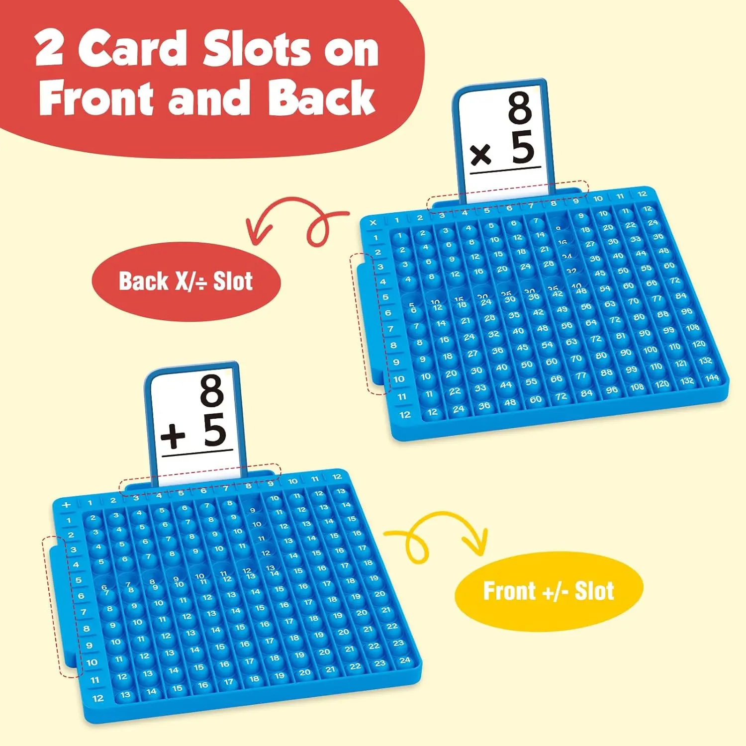 Make Learning Math Interesting: This math flash cards & math board multiplication chart 12x12 is such a great educational fun math game for the kids, they can learn and understand the math facts while playing games • Multiplication & Division & Addition & Subtraction: The multiplication table prints on a double side, one side for multiplication and division and the other side for addition and subtraction. You can learn together with flashcards for studying, each flashcard has two equations and the answers are on the back of the cards, making your child learn math more efficiently • Stress Relieve & Intelligence Training: While pressing the button of the board, There will be a slight sound. It will make people feel comfortable and relieve stress. Learning and playing with these math manipulatives can help to exercise the flexibility and sensitivity of the fingers, conducive to intellectual development • Convenient and Organized: The flashcards are hole-punched so you can easily organize them by type using the included metal rings to ensure you will not lose the card, and the cards of different colors make sorting easier • Unique Design: The board times table is made of silicone material, soft and washable. Our math flashcards are made only with card stock paper with smooth and laminated coating, children can write down the answers on the cards with dry-erase markers, and easily wipe off