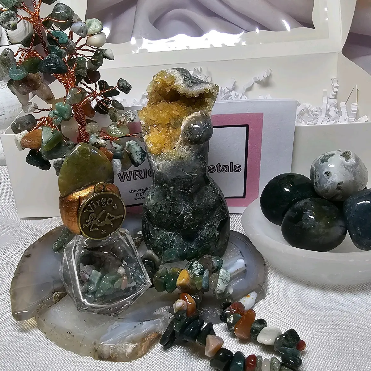 This crystal SET features a collection of MOSS AGATE items that will bring VIRGO{Aug23-Sep22} an abundance of good luck! VIRGOS are considered loyal, logical, hardworking, and kind. Overall, Virgos are considered perfectionists. They are extremely practical and want things to be accomplished in the right way. They are also highly creative and can generate many ideas and solutions quickly and effectively. Moss agate is a stone that is beneficial to all Earth signs, including Virgos. Virgos enjoy being outside in the natural world, and they often have a strong connection to animals. Moss agate allows Virgos to pause their busy lives and focus on the bigger picture. Moss agate can ground this sign, too, causing them to relate with their surroundings, rather than micromanaging their life so they can focus on strenuous tasks. Virgos often struggle to communicate effectively with others, as many perceive their comments as critical. However, moss agate helps improve communication skills.