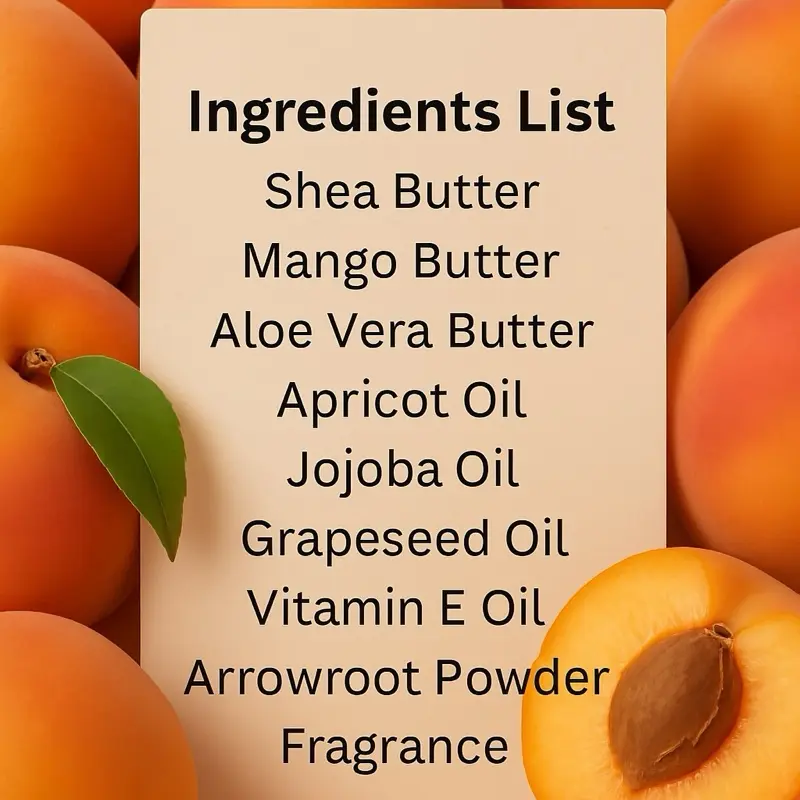 Shea Butter,Mango Butter,Aloe Vera Butter,Apricot Oil Jojoba Oil,Grapeseed Oil,Vitamin E Oil,Arrowroot Powder & Fragrance
