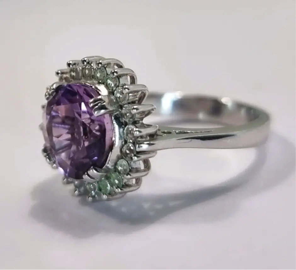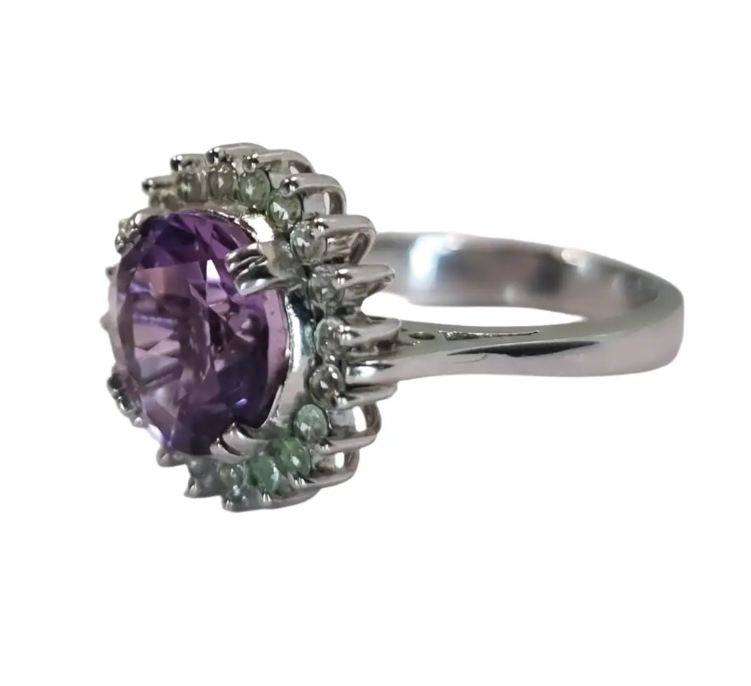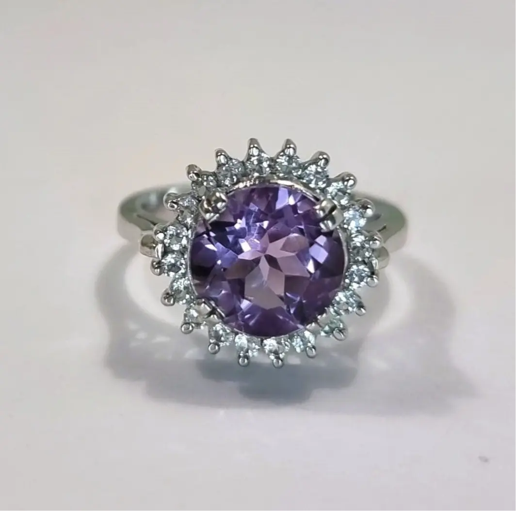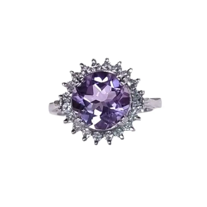 The vibrant purple gem takes center stage, captivating the eye with its mesmerizing hue. It is skillfully set in a bed of shimmering white zircon side stones, creating a breathtaking half halo of sparkle that enhances the allure of the Amethyst.