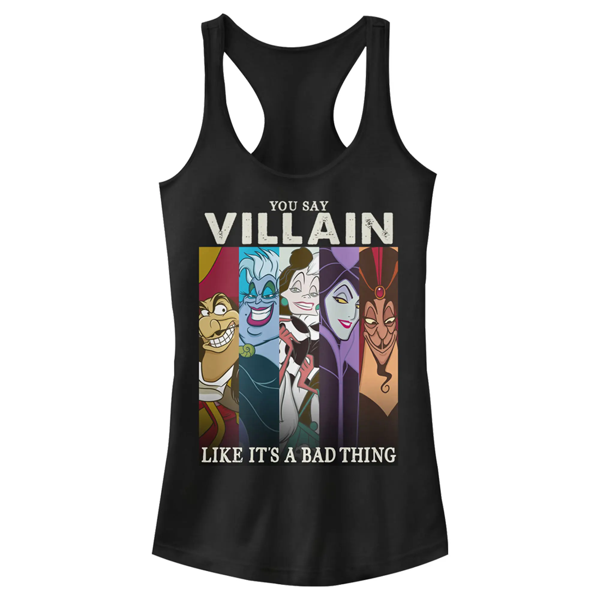 The villains always have the best outfits, just check them out on the Disney Not a Bad Thing Juniors' Racerback Tank Top. All your favorite villains like Hook, Ursula, Cruella de Vil, Maleficent, and Jafar are featured in panels across this tank with "You Say Villain Like It's a Bad Thing" across the front. You'll love this fashion that shows off a bright look and is perfect for Disney fans everywhere!