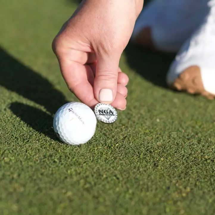 No Girls Allowed (NGA) presents the "Frosted" Crystal Diamond Ball Marker and Hat Clip. This set combines elegance with practicality, making it a must-have for any golfer. The crystal border adds a sophisticated touch to your golf gear. It keeps your hat secure during play, ensuring you're always ready to hit the course.