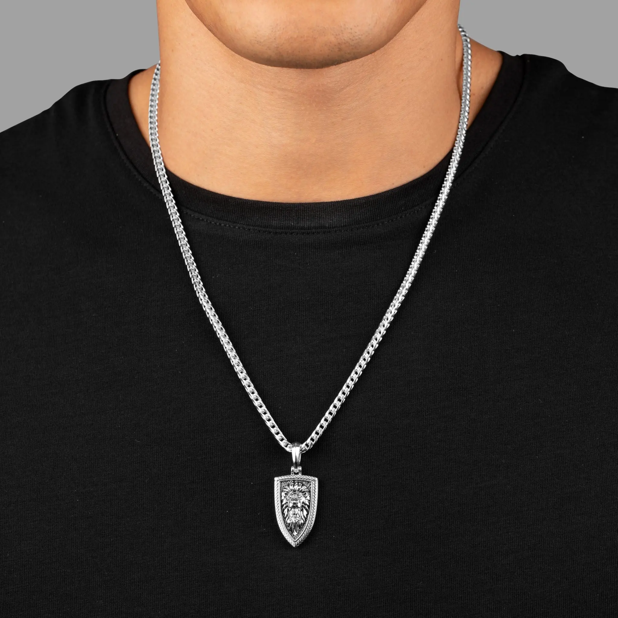 This silver lion pendant, named Empire, depicts a sterling silver lion head, roaring within a shield and displaying the might and power of a ferocious born leader for all to behold. It is a powerful reminder that a beast and a king lives within us all, and its power must be unleashed in the battle to forge our Empires.