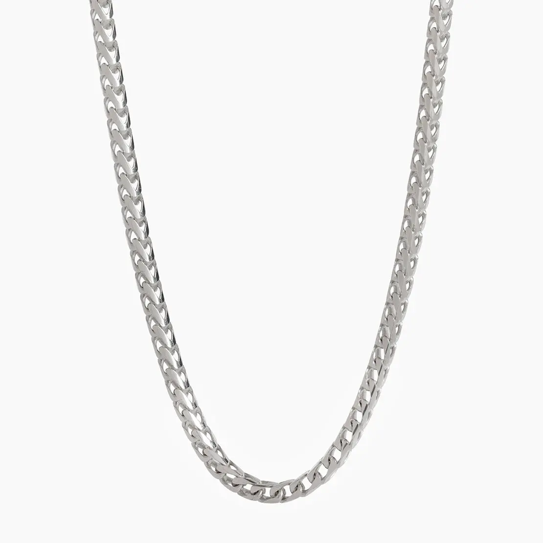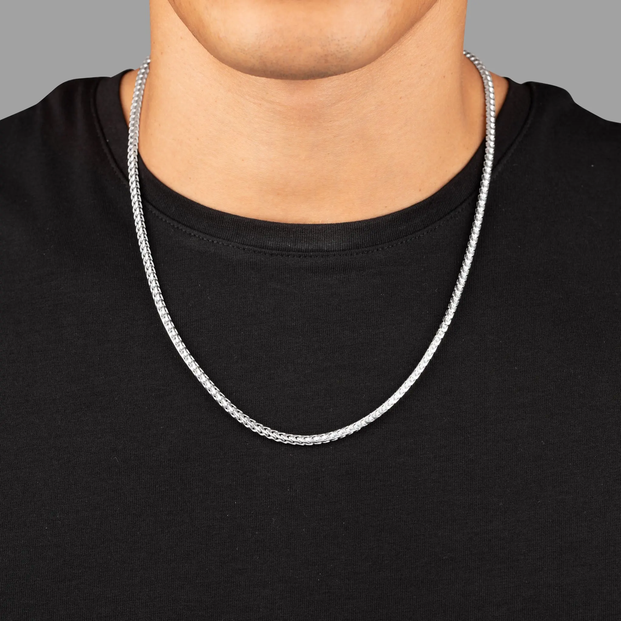 This 3mm silver franco chain is crafted in Italy in solid sterling silver and rhodium plated for maximum protection and shine. The luxurious silver chain for men is stamped with the .925 quality hallmark symbol for quality guarantee.