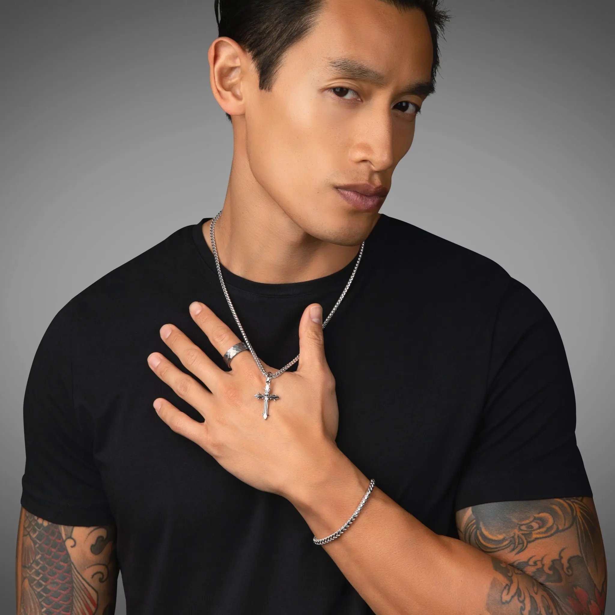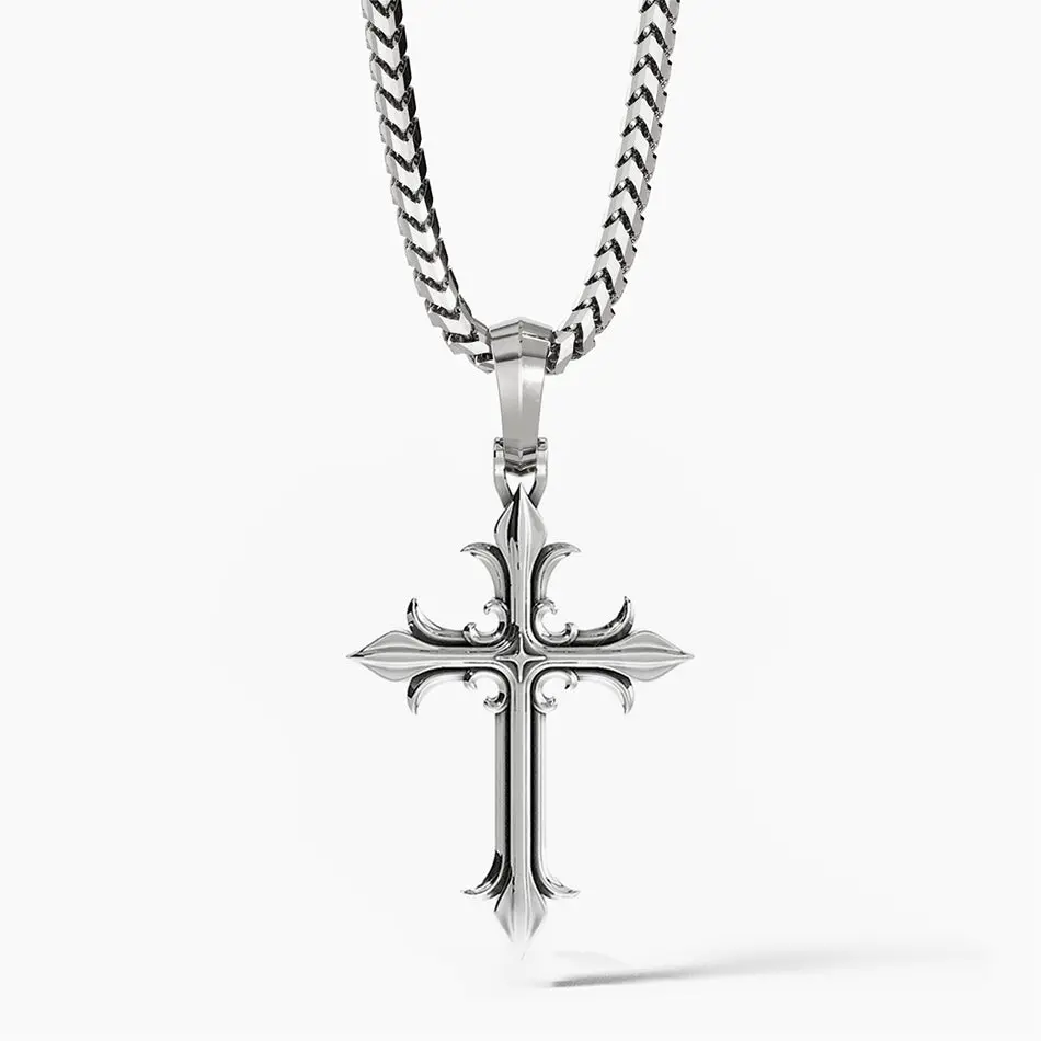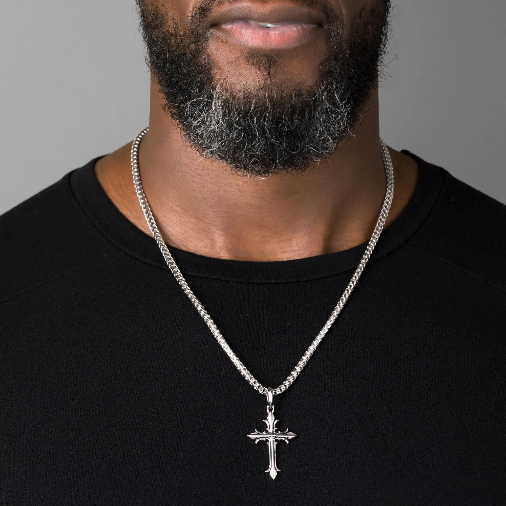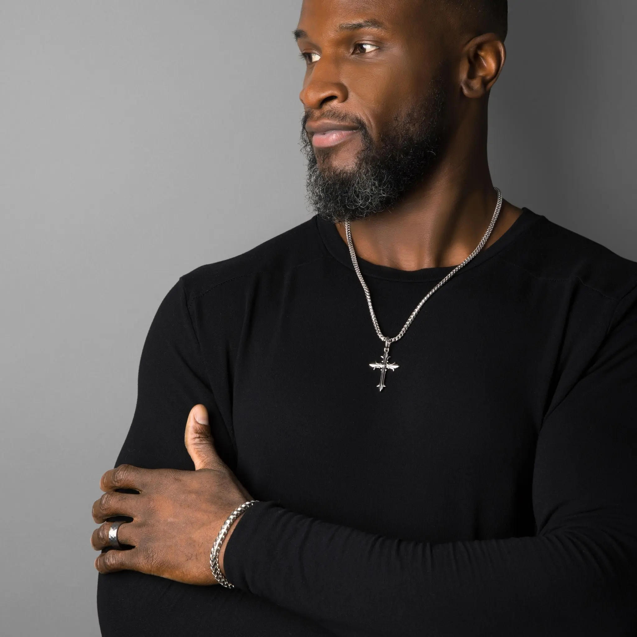 This mens silver cross pendant is solid sterling silver and rhodium plated for maximum protection and shine. The solid silver pendant for men is designed, sculpted, and handcrafted by artisan jewelers, and the quality is second to none.