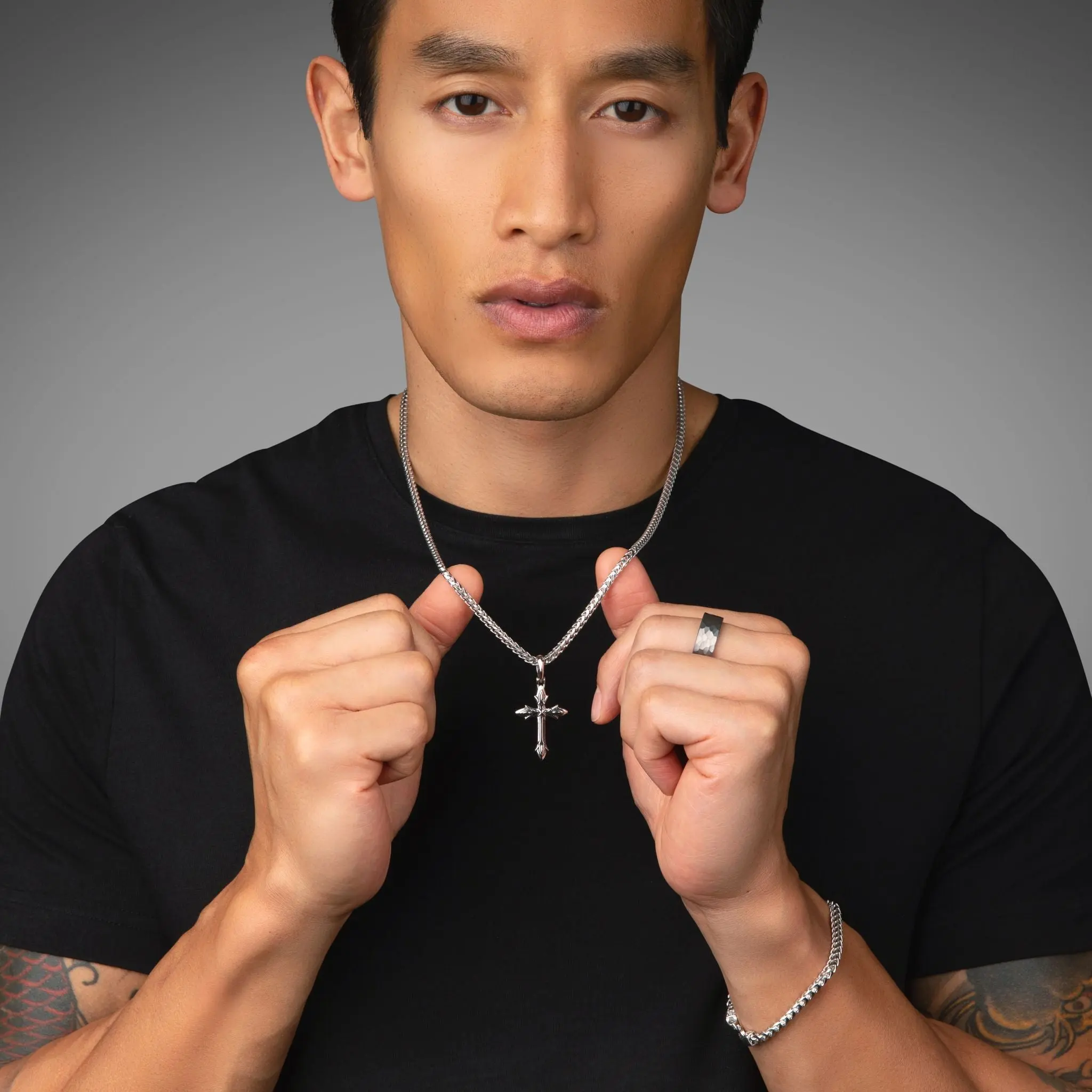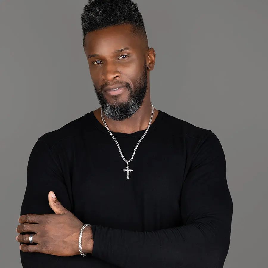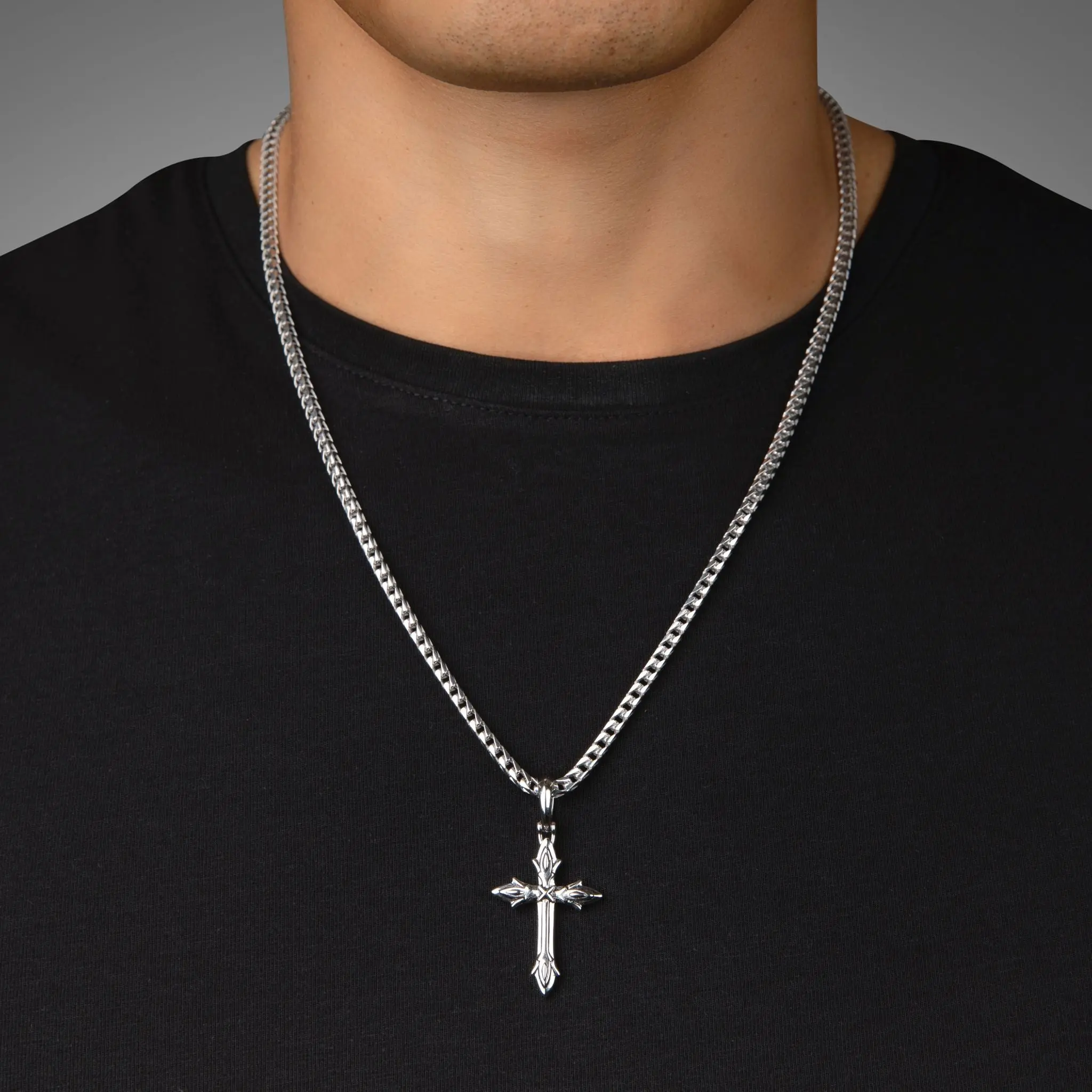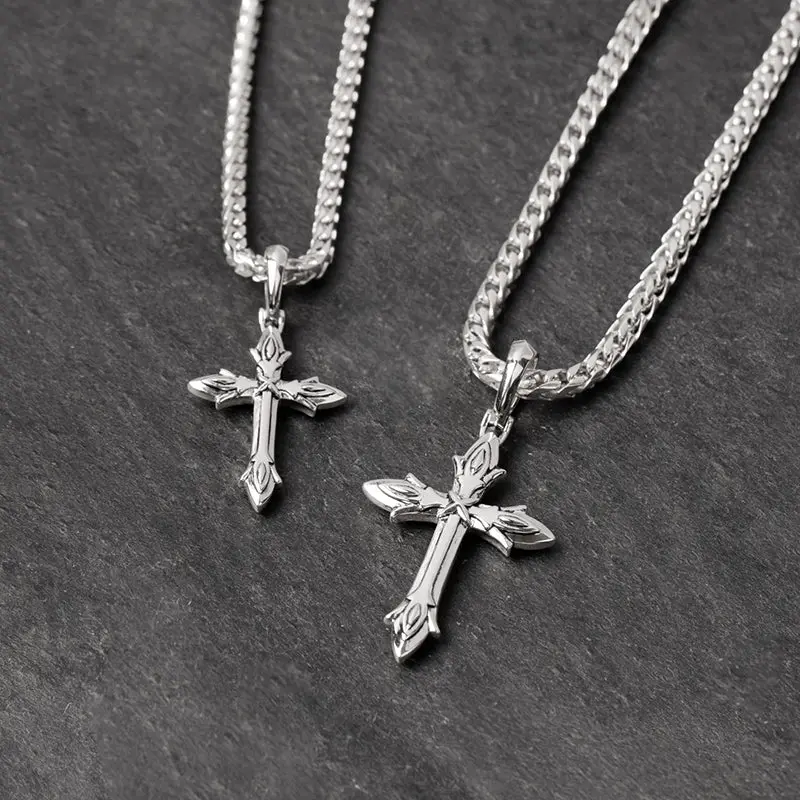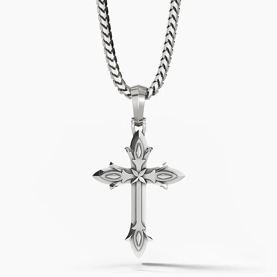 This mens silver cross pendant is solid sterling silver and rhodium plated for maximum protection and shine. The solid silver pendant for men is designed, sculpted, and handcrafted by artisan jewelers, and the quality is second to none.
