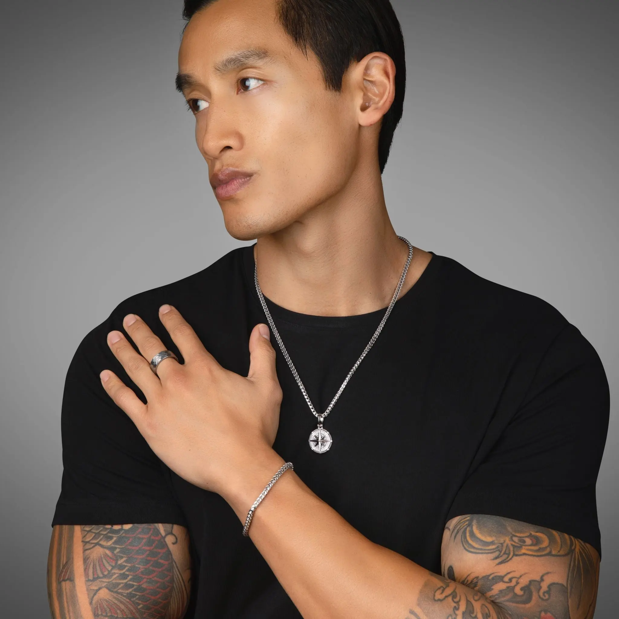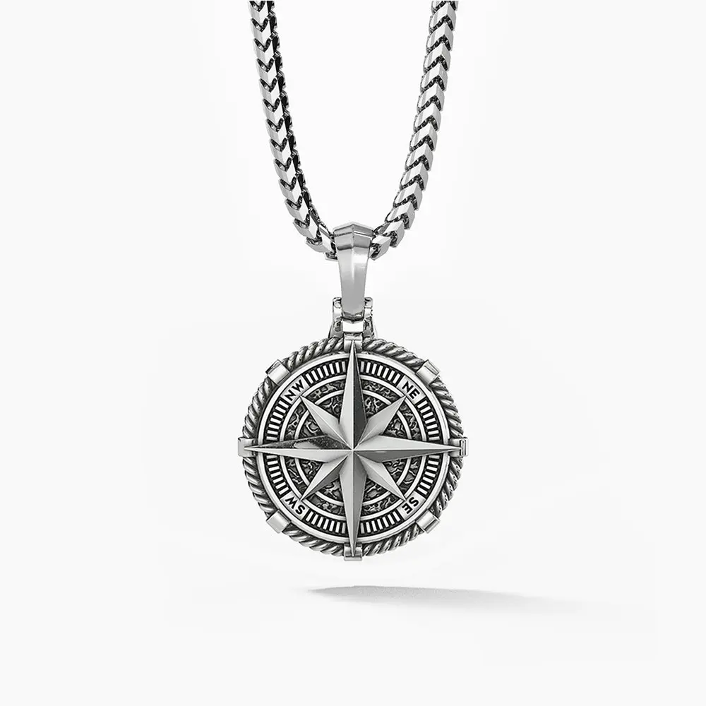 This mens silver compass pendant is solid sterling silver and rhodium plated for maximum protection and shine. The solid silver pendant for men is designed, sculpted, and handcrafted by artisan jewelers, and the quality is second to none.