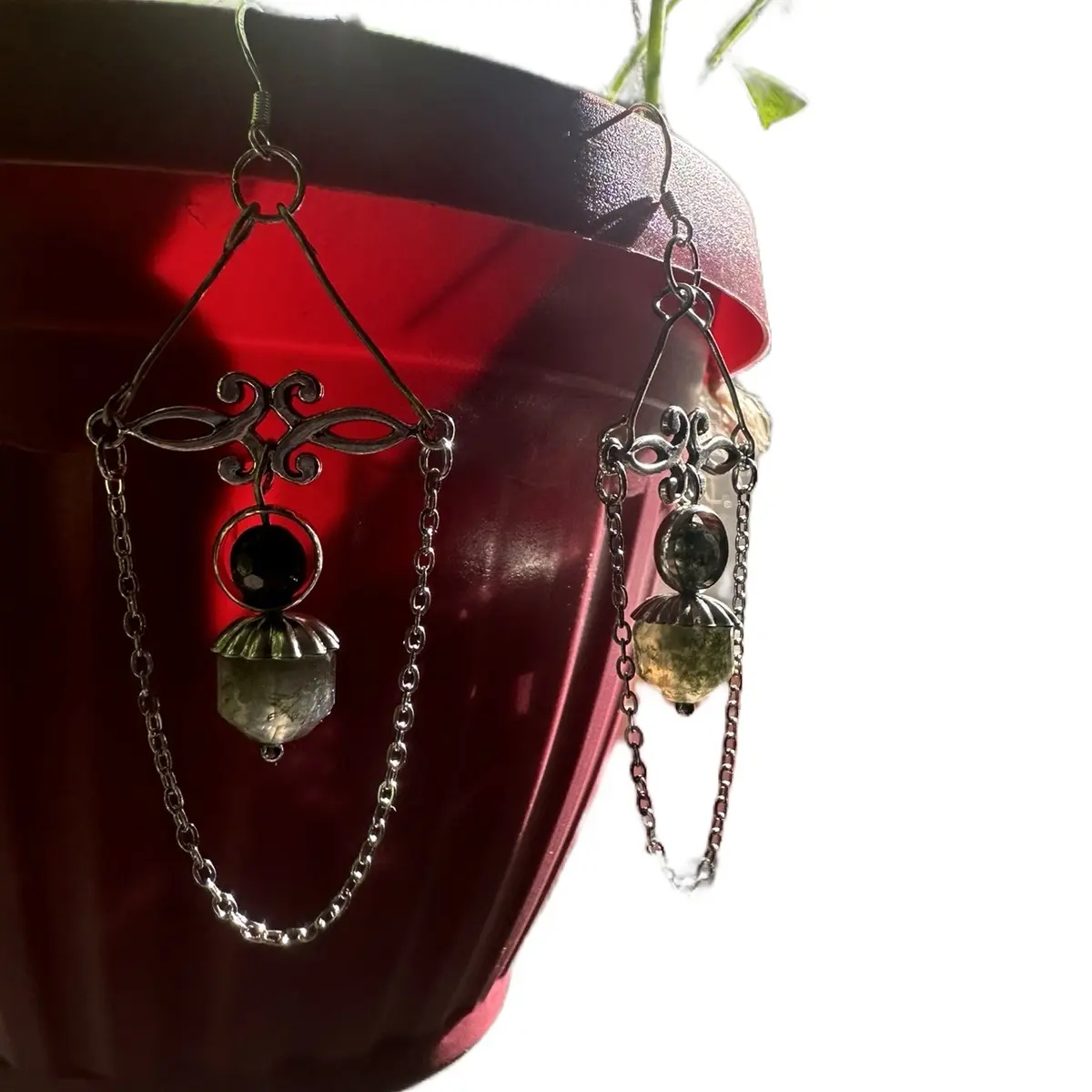 These earrings are a beautiful and natural accessory that features moss agate and stainless steel. The moss agate is a unique and attractive stone that is believed to have healing properties. It is also said to bring abundance and prosperity to the wearer. The earrings are hand-made, which means that each pair is unique and has a personal touch.