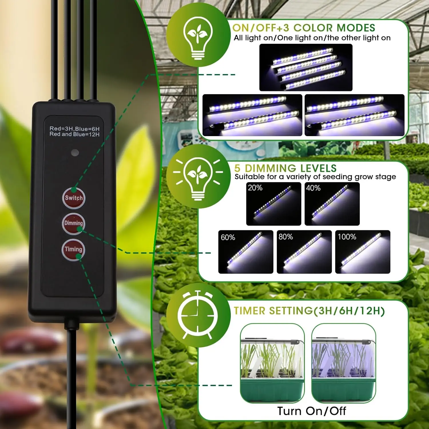 [Versatile Brightness Control & Convenient Timer] Featuring 5 adjustable brightness levels(20%-100%), our grow light meets the diverse lighting needs of plants throughout their growth cycle. Plus, with 3 timer settings (3/6/12H), you can schedule lighting cycles hassle-free, even when you're away, ensuring uninterrupted plant care.