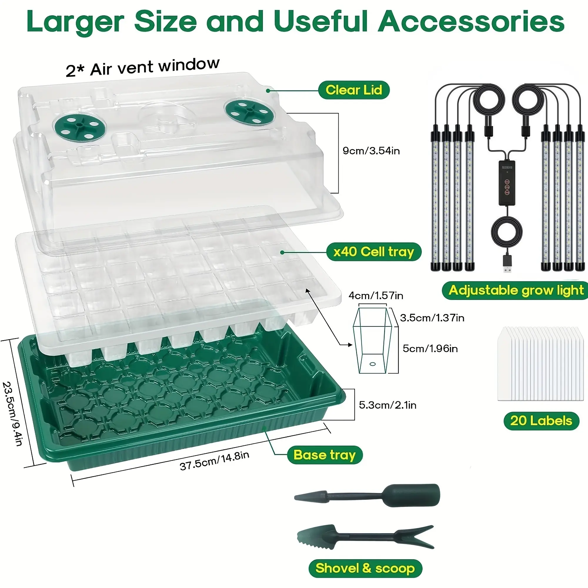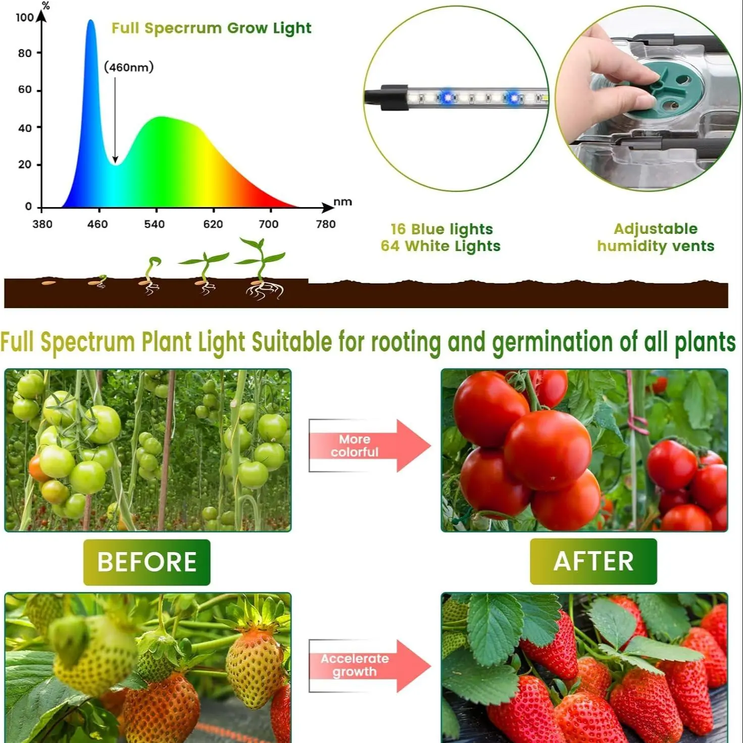 [Premium Full Spectrum Plant Lighting & Humidity Control] Our seeding starter trays, each equipped with dual adjustable plant lights, provide customized illumination perfect for every phase of seedling growth. Seamlessly adjust light intensity and duration to stimulate rapid, vigorous development, resulting in strong, healthy plants. With 8 adjustable vents integrated into each cover, managing airflow becomes effortless, allowing you to fine-tune temperature and humidity levels specific to each