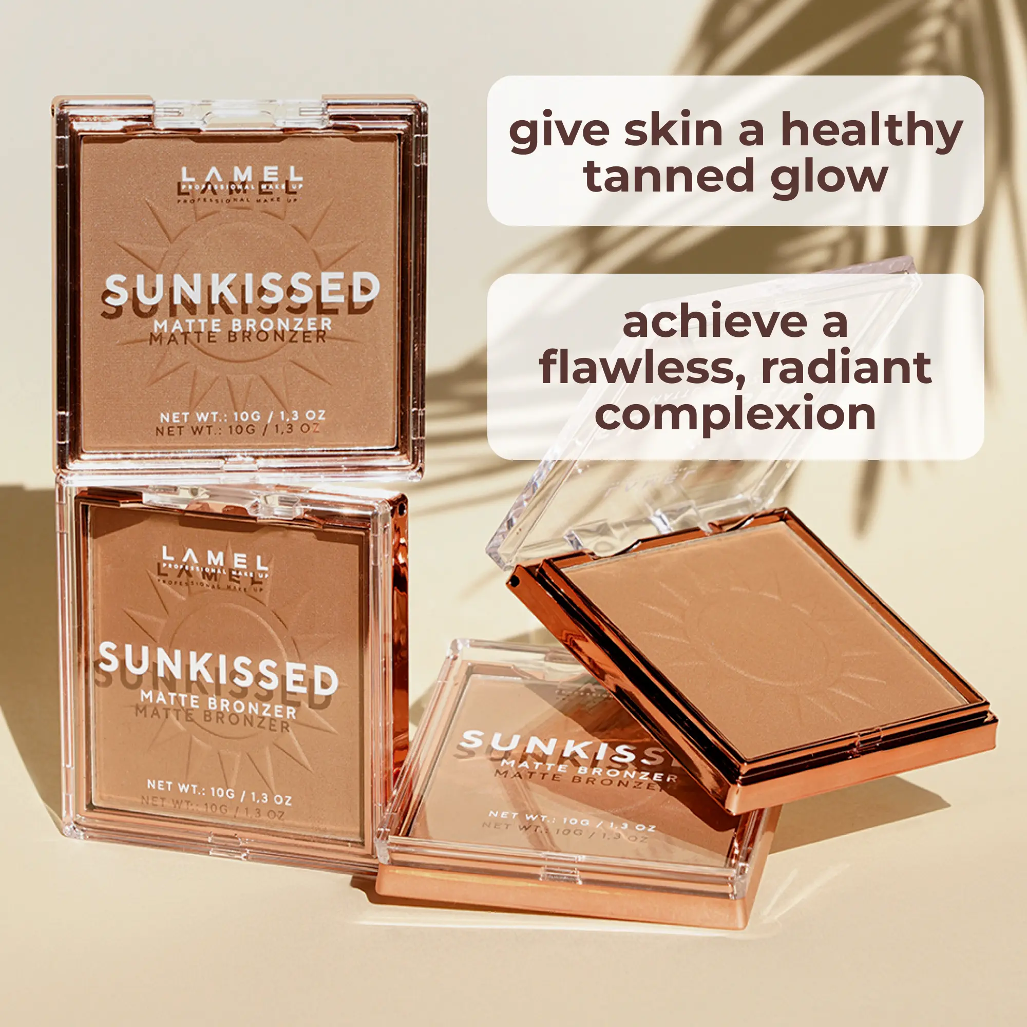 Compact bronzing powder provides matt finish and natural tan in any season. The perfect shade provids a natural, sun-kissed look or accentuating a tan.