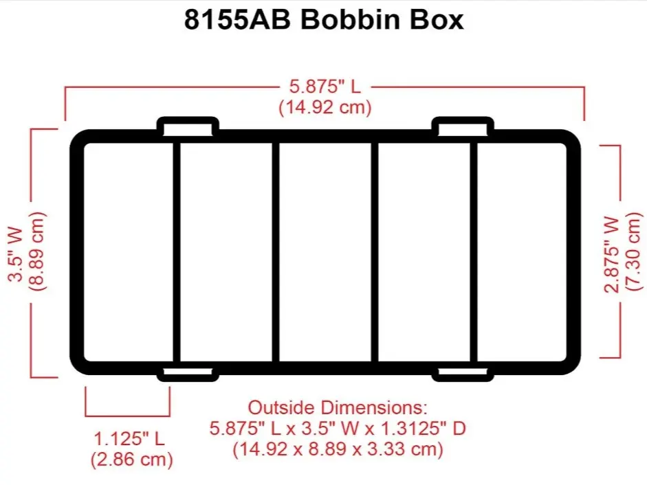 ·Product Details: The bobbin box measures 5.875 x 3.5 x 1.3125 inches. Comes in a translucent color. Made in the U.S.A.