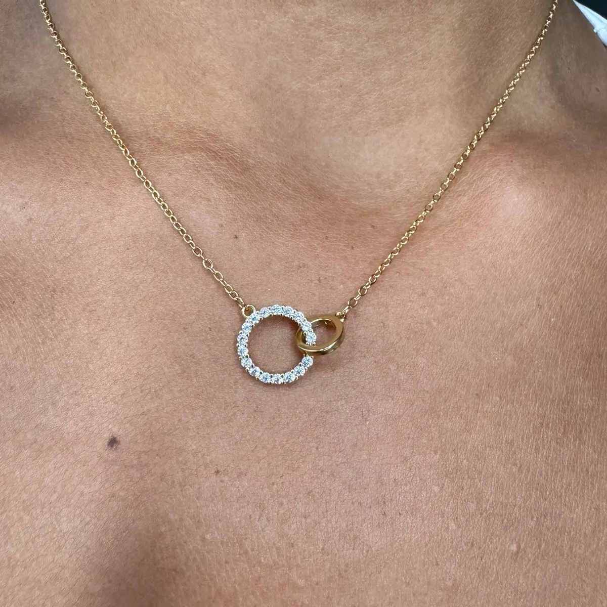 This gold plated .925 sterling silver ring is a perfect representation of love and commitment. The two rings represent marriage, siblings, or children, making it a meaningful piece of jewelry for those special occasions. The dainty 16-18” length of the ring is perfect for those who prefer a delicate and subtle look.
