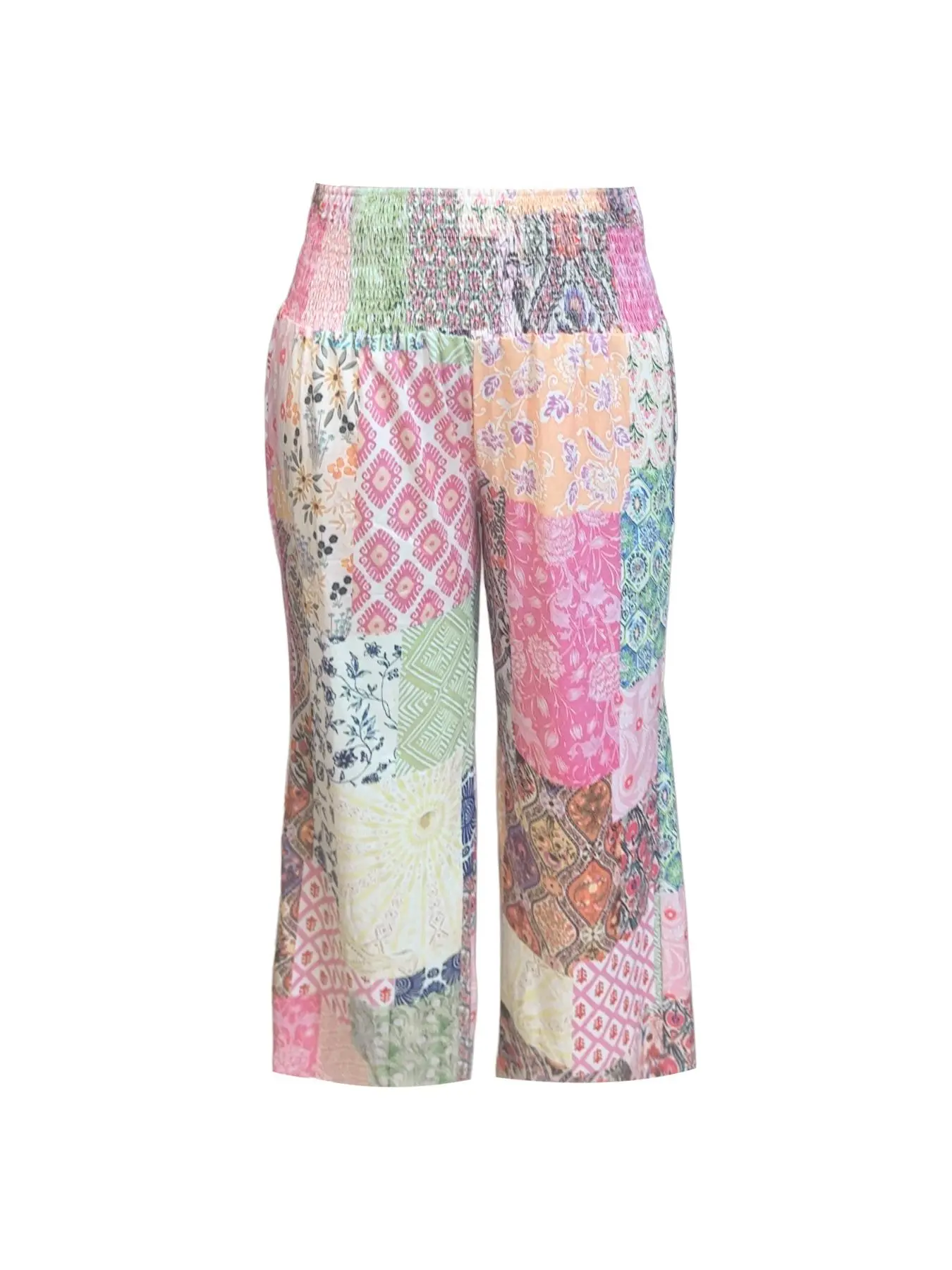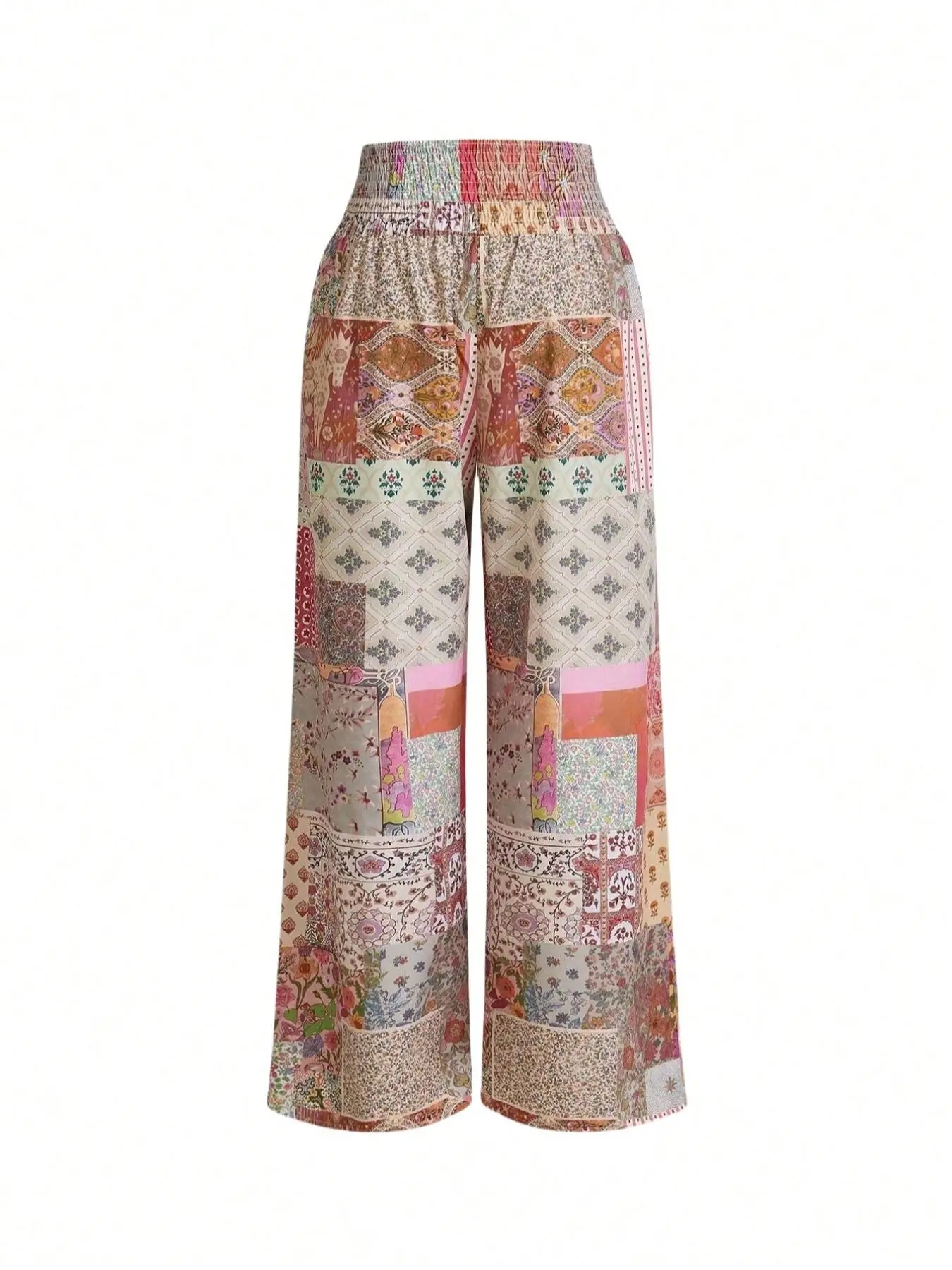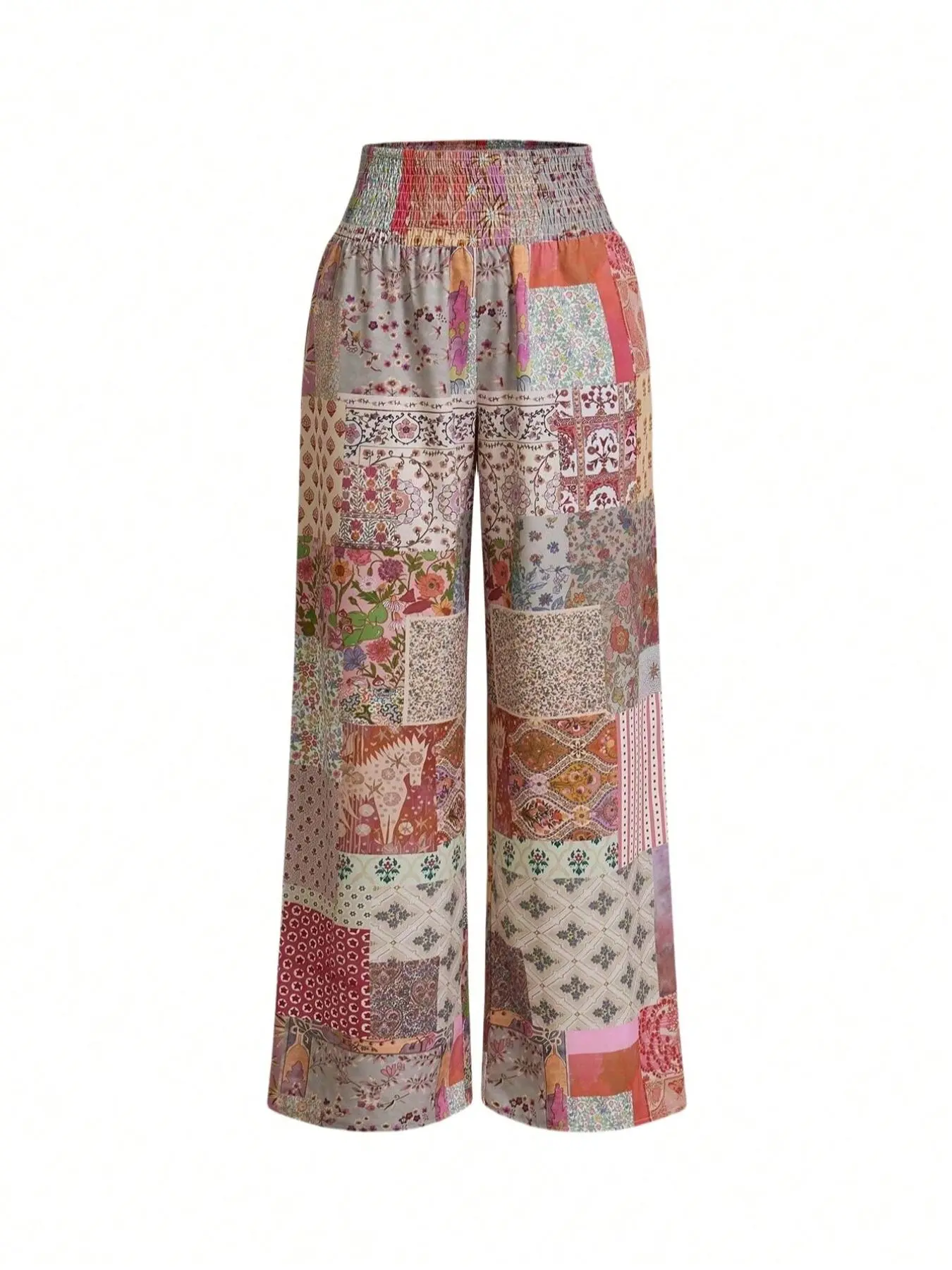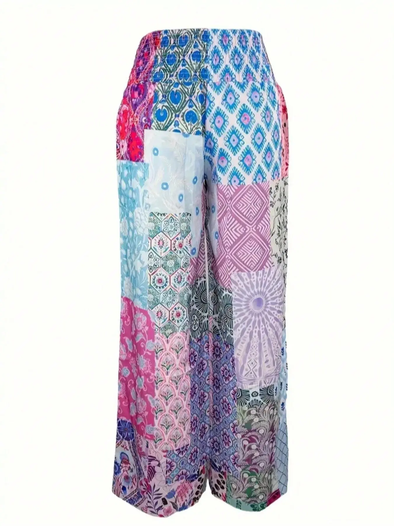 Plus Size Patchwork Print Plicated Shirred Wide Leg Pants, Casual Lounge Pants, Boho Casual High Waist Trousers, Casual Bohemian Trousers for Daily Vacation Holiday Wear, Women's Bottoms for All Seasons