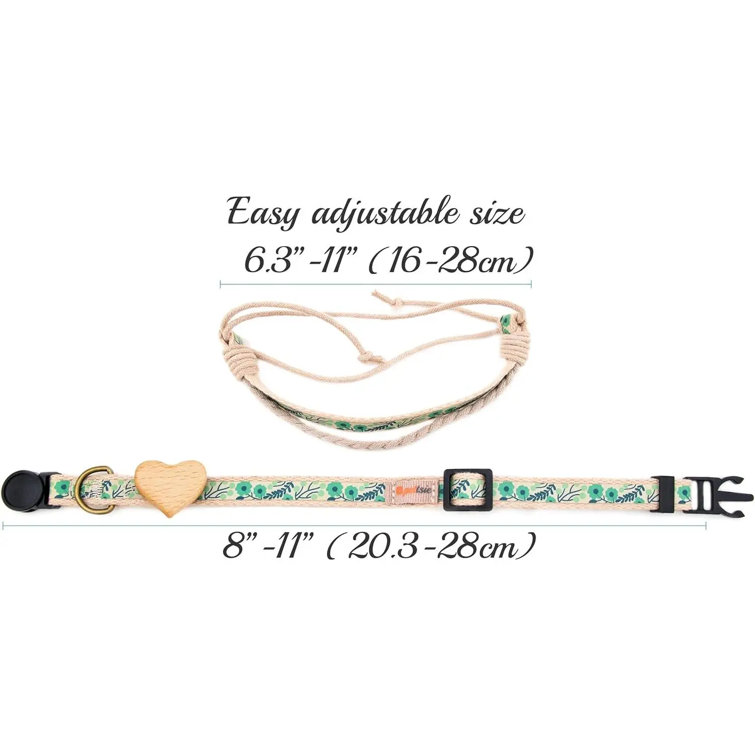 The cat collar is adjustable for neck sizes from 8-inch to 11-inch and is suitable for most cats. The unisex bracelet is adjustable from 6.3-inch to 11-inch. The width of the collar and bracelet is 3/8“. The pet collar and bracelet are available in modern colors pink, turquoise and green.